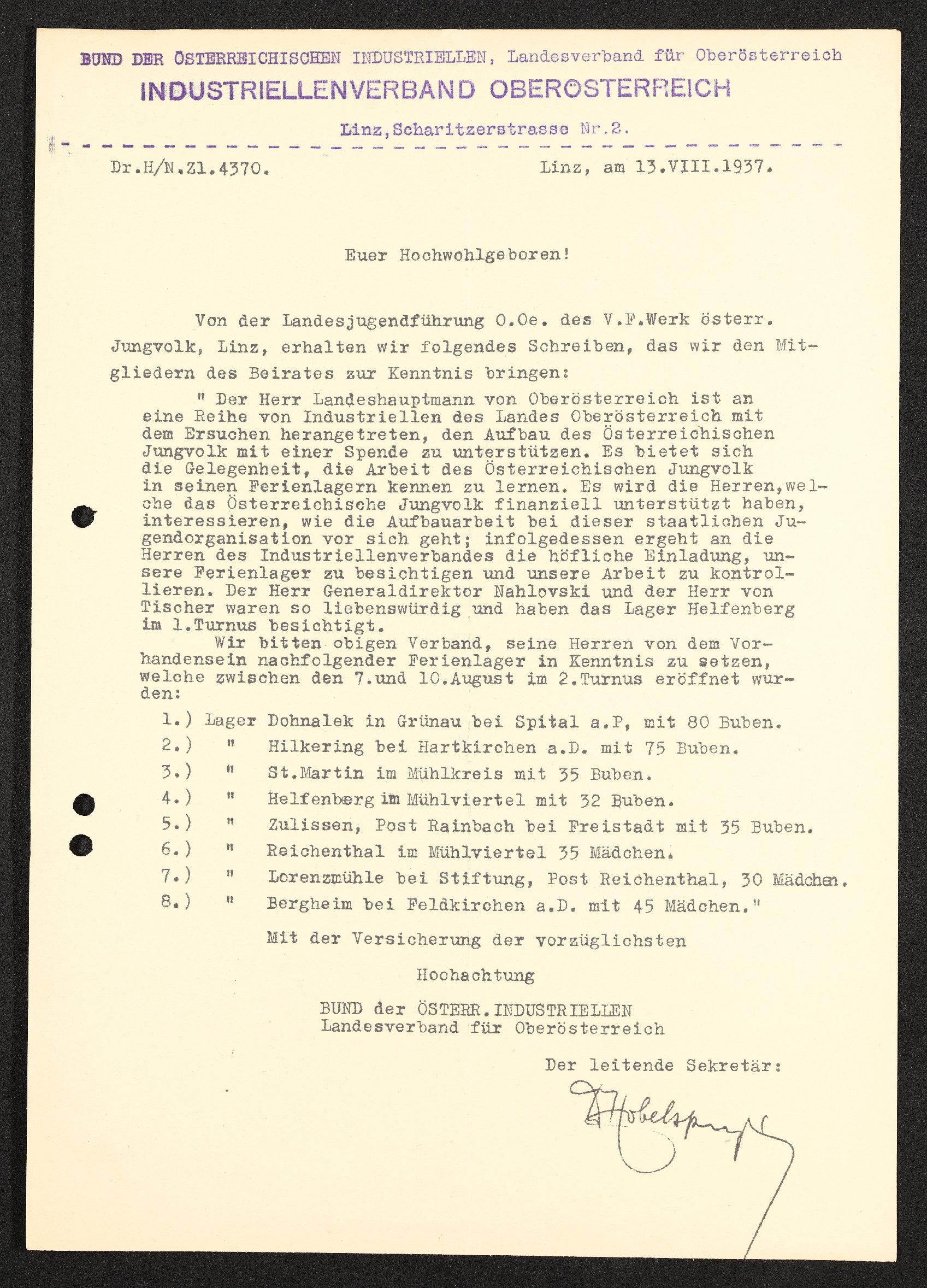 | Beschreibung | Schreiben von der Landesjugendführung Oberösterreich der Vaterländischen Front, Österreichisches Jungvolk an den Bund der österreichischen Industriellen, Landesverband für Oberösterriech, Industriellenverband Oberösterreich, Linz, 13. August 1937 |
