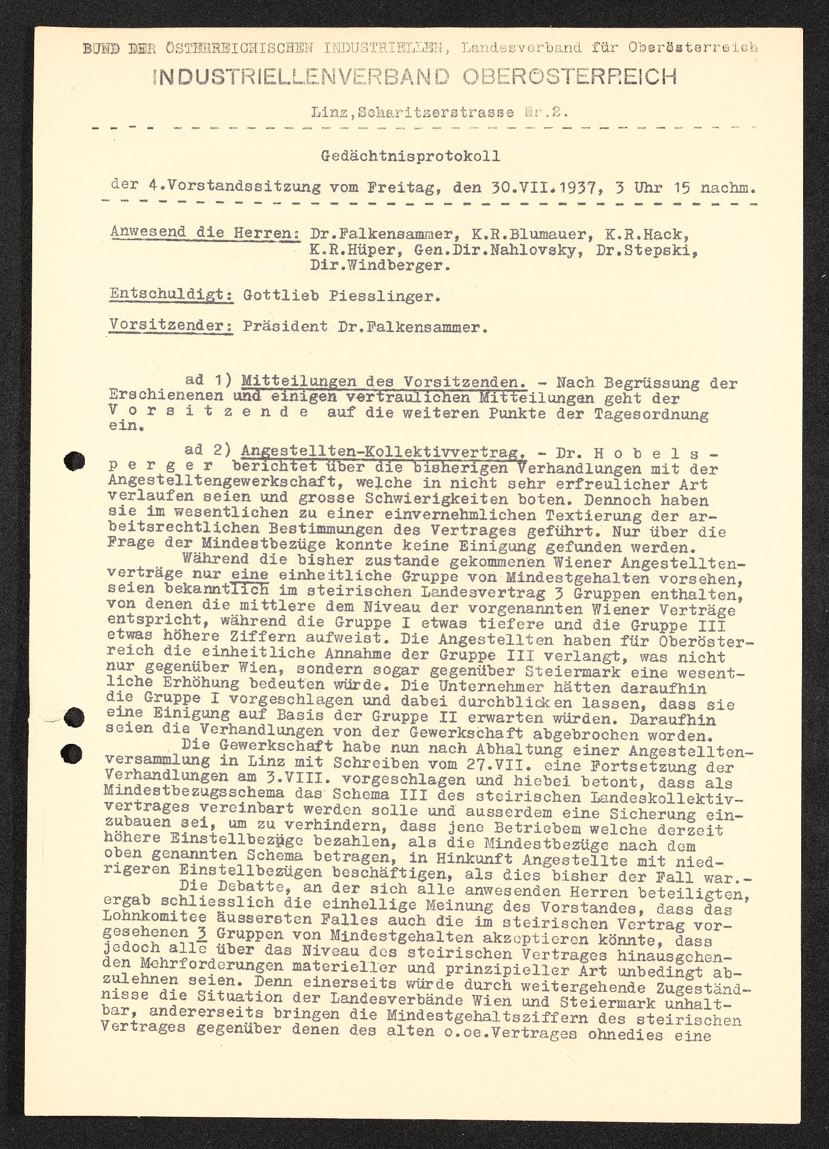 | Beschreibung | Gedächtnisprotokoll zur vierten Vorstandssitzung, Bund der österreichischen Industriellen Landesverband für Oberösterriech, Industriellenverband Oberösterreich |