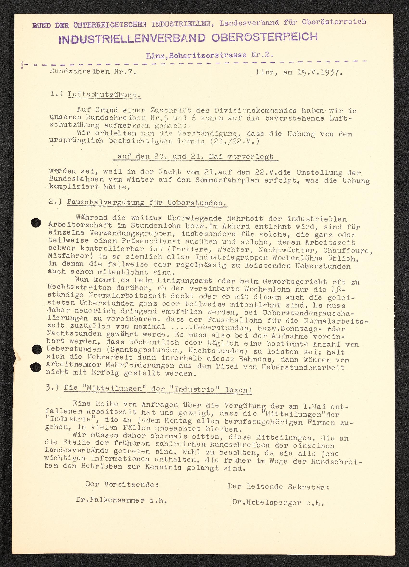 | Beschreibung | Rundschreiben Nr. 7, Linz, 15. Mai 1937, Bund der österreichischen Industriellen Landesverband für Oberösterriech, Industriellenverband Oberösterreich |
