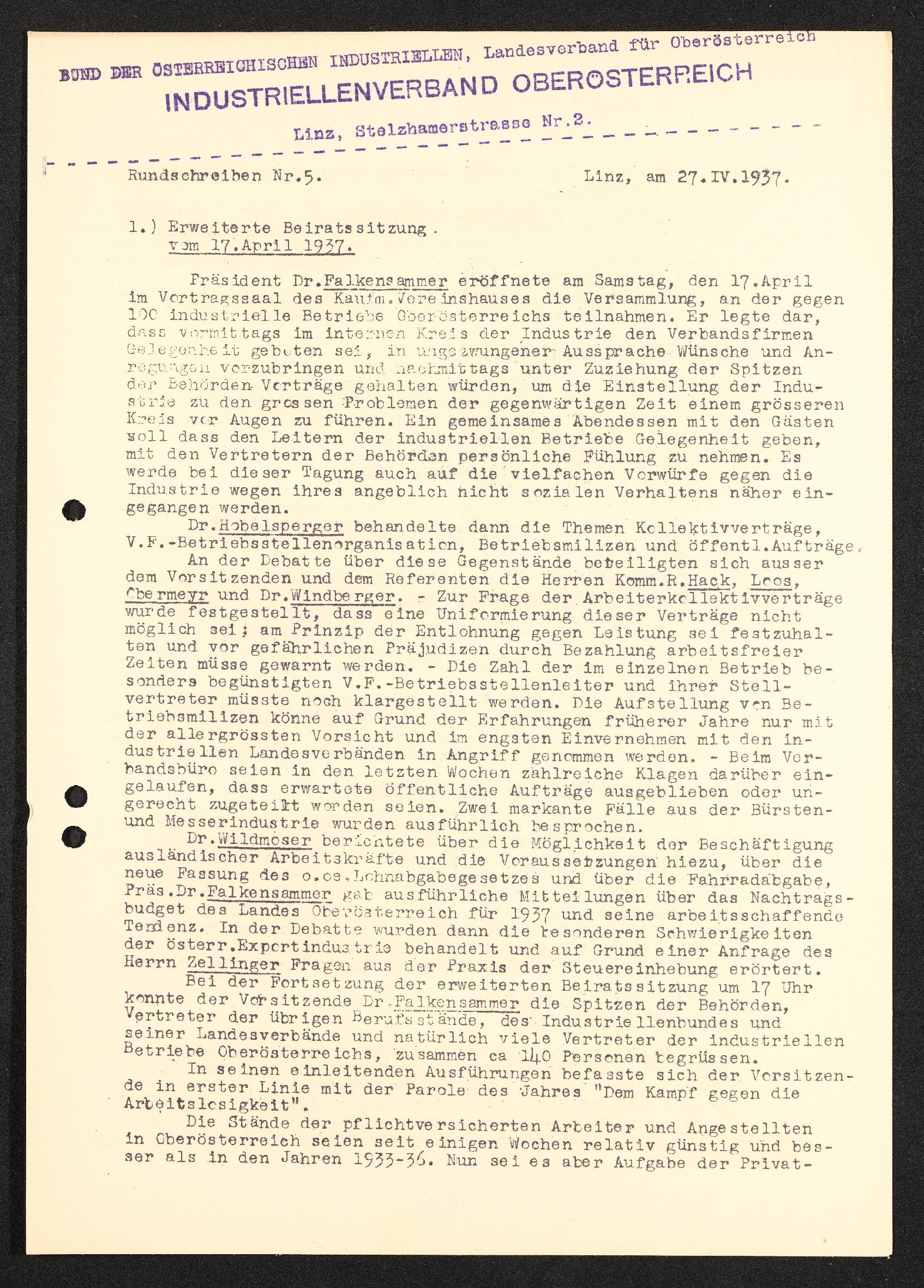 | Beschreibung | Rundschreiben Nr. 5, Linz, 27. April 1937, Bund der österreichischen Industriellen Landesverband für Oberösterriech, Industriellenverband Oberösterreich, Erweiterte Beiratssitzung |