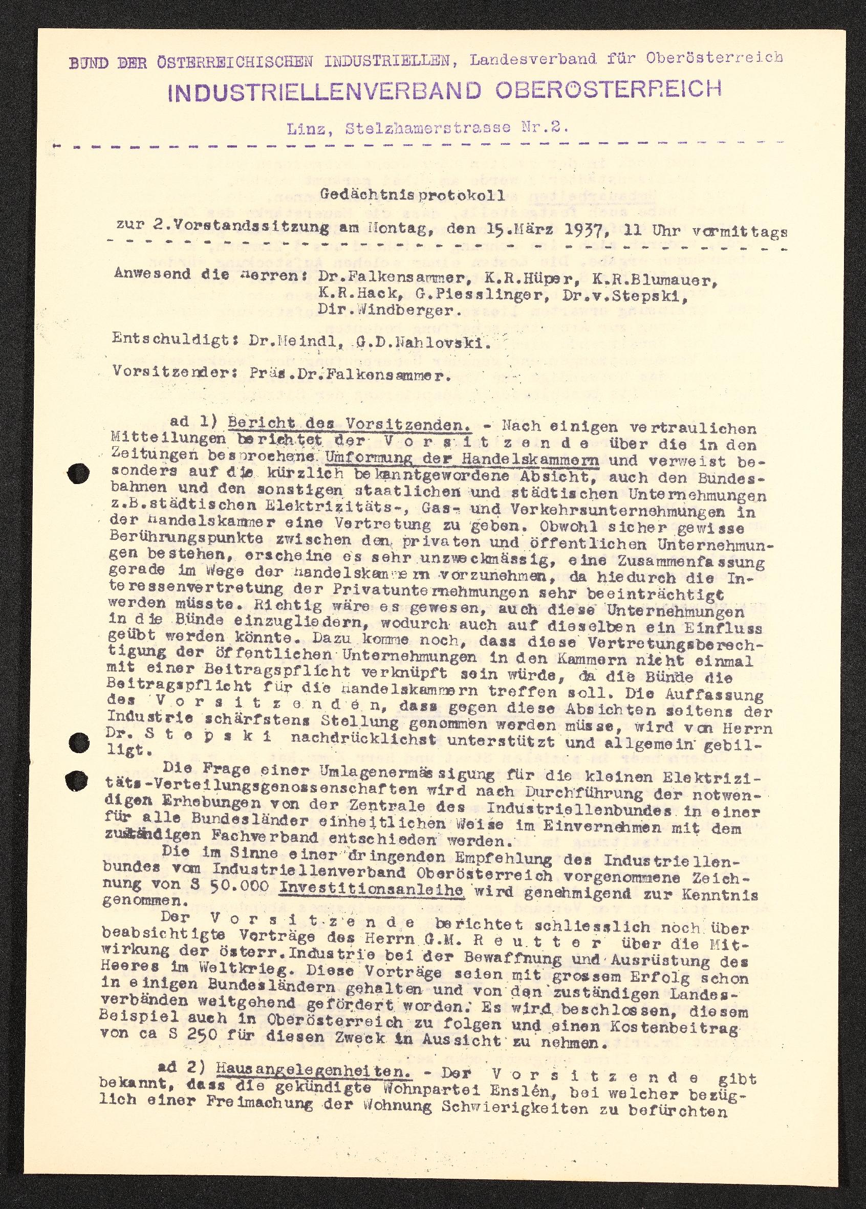 | Beschreibung | Gedächnisprotokoll zur 2. Vorstandssitzung am 15. März 1937, Bund der österreichischen Industriellen Landesverband für Oberösterriech, Industriellenverband Oberösterreich |