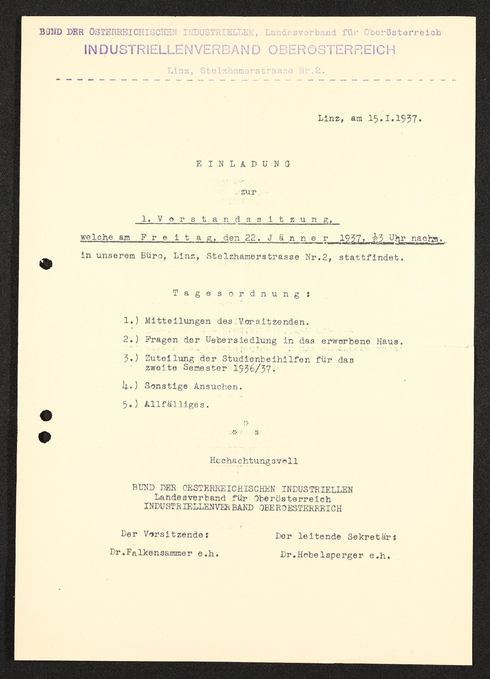 | Beschreibung | Einladung zur 1. Vorstandssitzung, Linz, 15. Jänner 1937, Bund der österreichischen Industriellen Landesverband für Oberösterriech, Industriellenverband Oberösterreich |