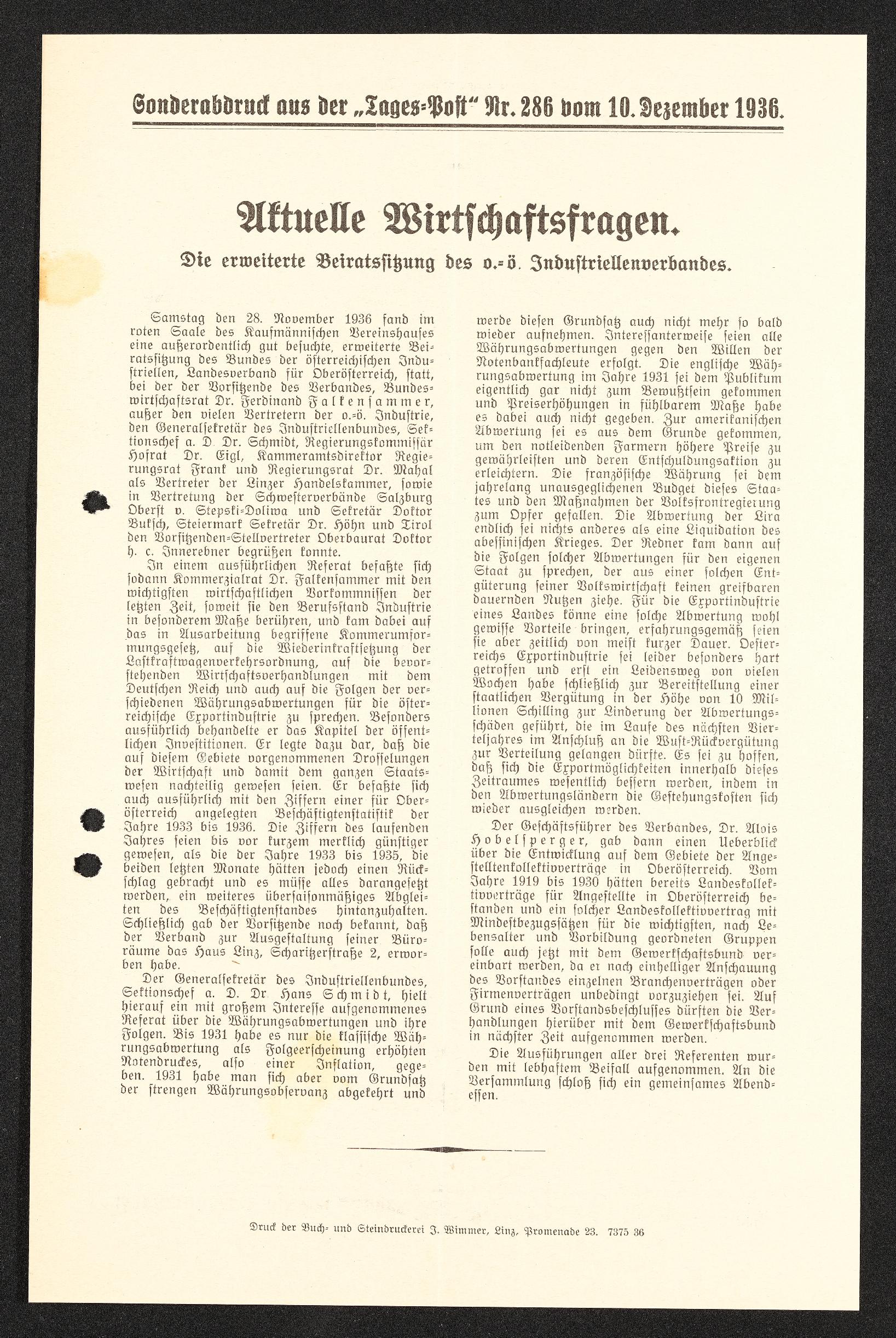 | Beschreibung | Sonderabdruck aus der Tages-Post, Nr. 286 vom 10. Dezember 1936, "Aktuelle Wirtschaftsfragen" |