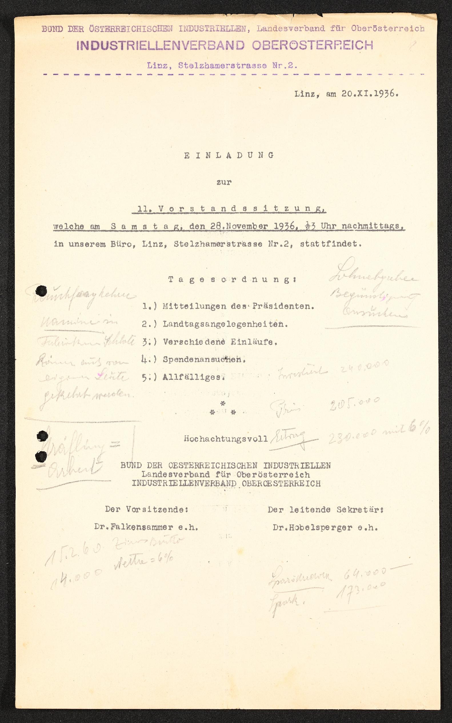 | Beschreibung | Einladung zur 11. Vorstandssitzung, Linz, 20. November 1936, Bund der österreichischen Industriellen, Landesverband für Oberösterriech, Industriellenverband Oberösterreich |
