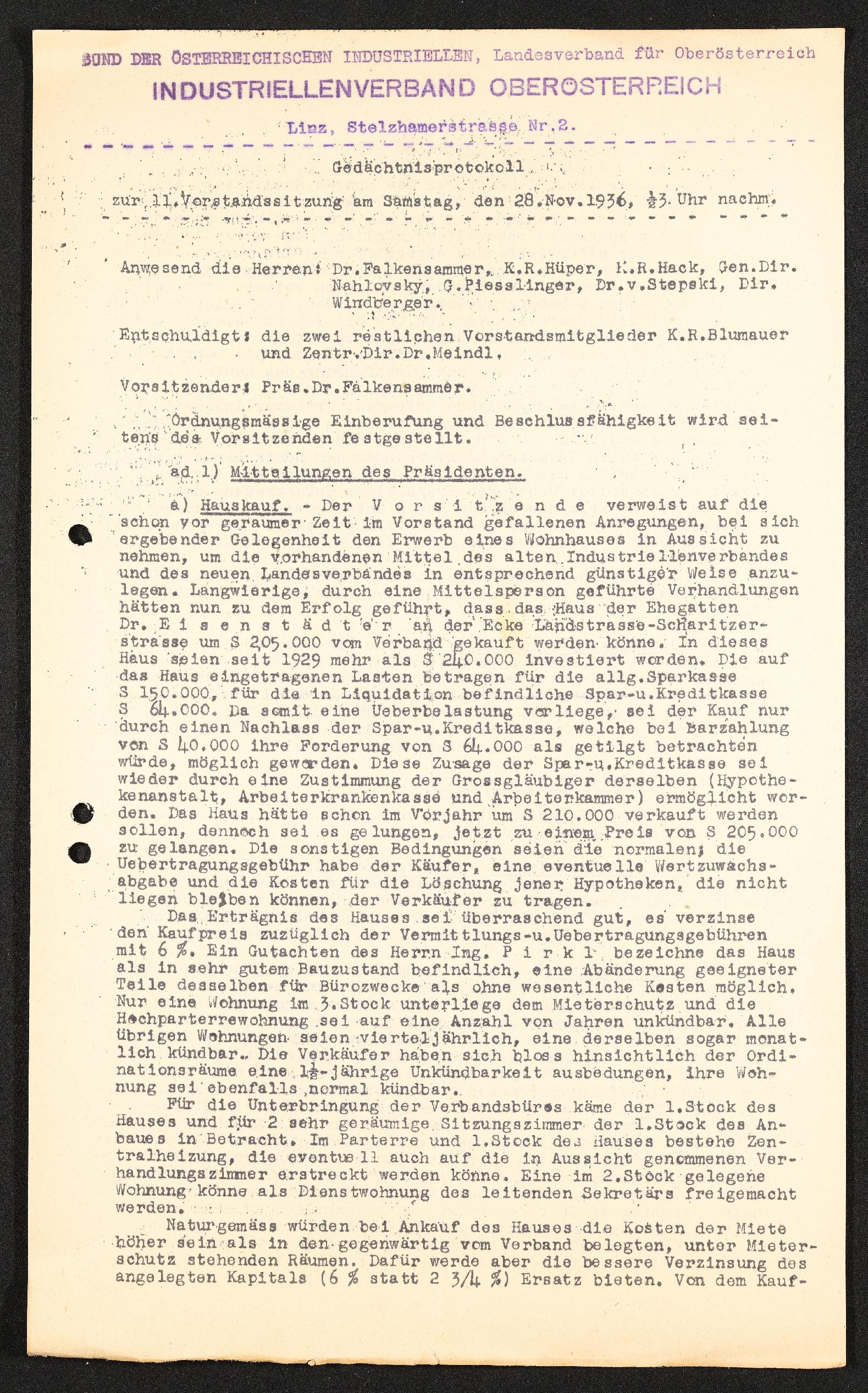 | Beschreibung | Gedächnisprotokoll zur 11. Vorstandssitzung am 28. November 1936, Bund der österreichischen Industriellen, Landesverband für Oberösterriech, Industriellenverband Oberösterreich |
