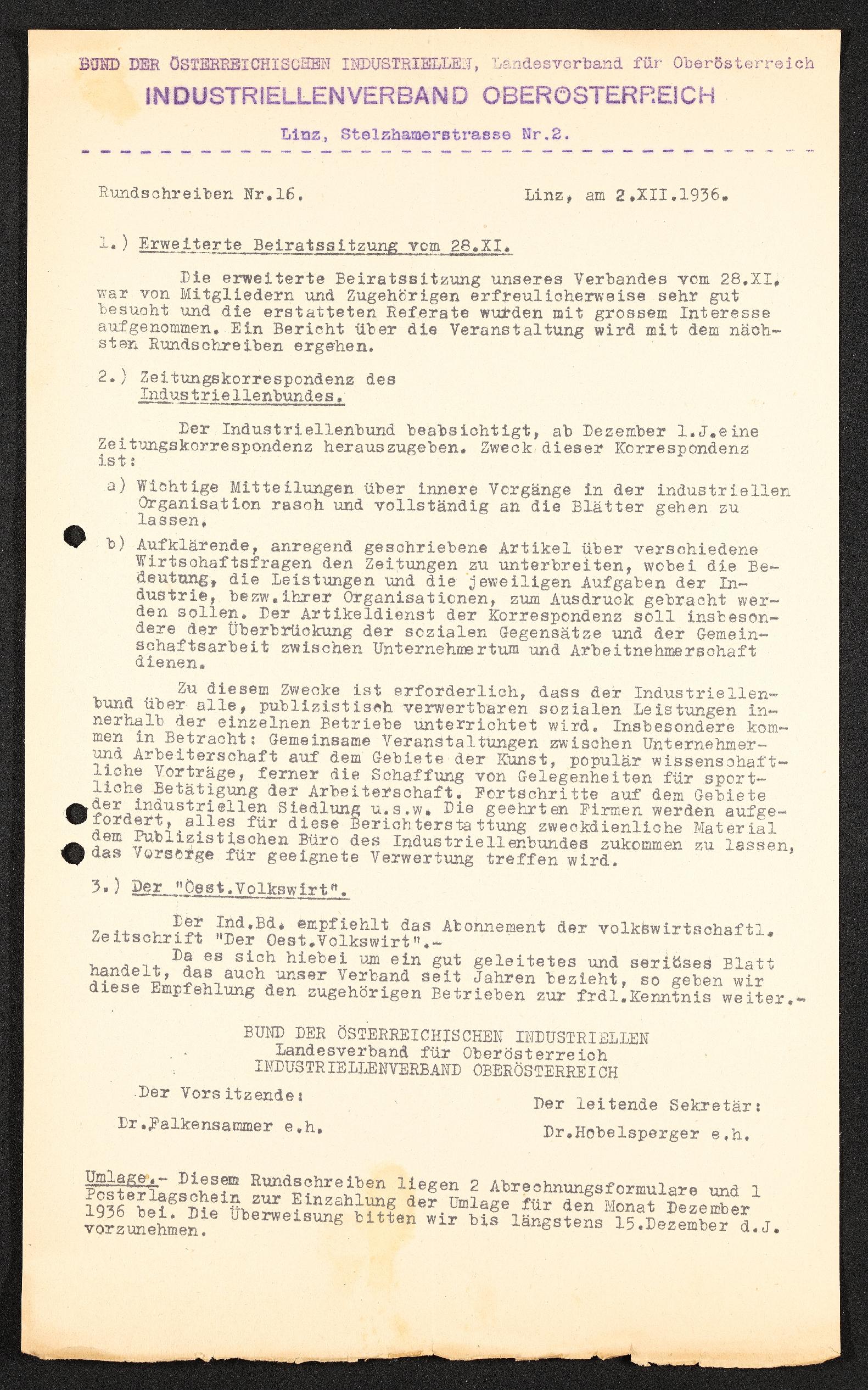 | Beschreibung | Runschreiben Nr. 16, Linz, 2. Dezember 1936, Bund der österreichischen Industriellen Landesverband für Oberösterriech, Industriellenverband Oberösterreich |