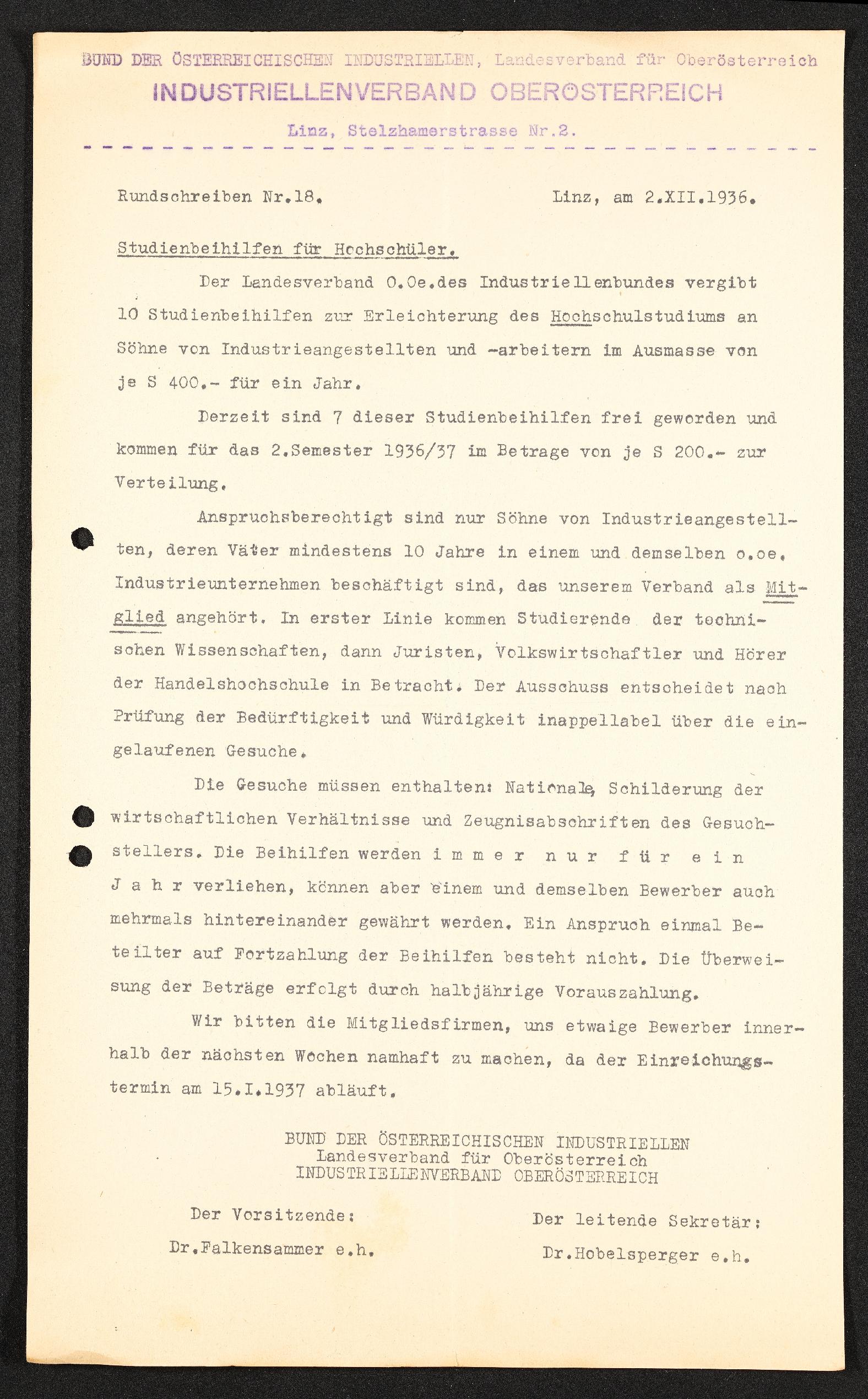 | Beschreibung | Runschreiben Nr. 18, Linz, 2. Dezember 1936, Bund der österreichischen Industriellen Landesverband für Oberösterriech, Industriellenverband Oberösterreich |