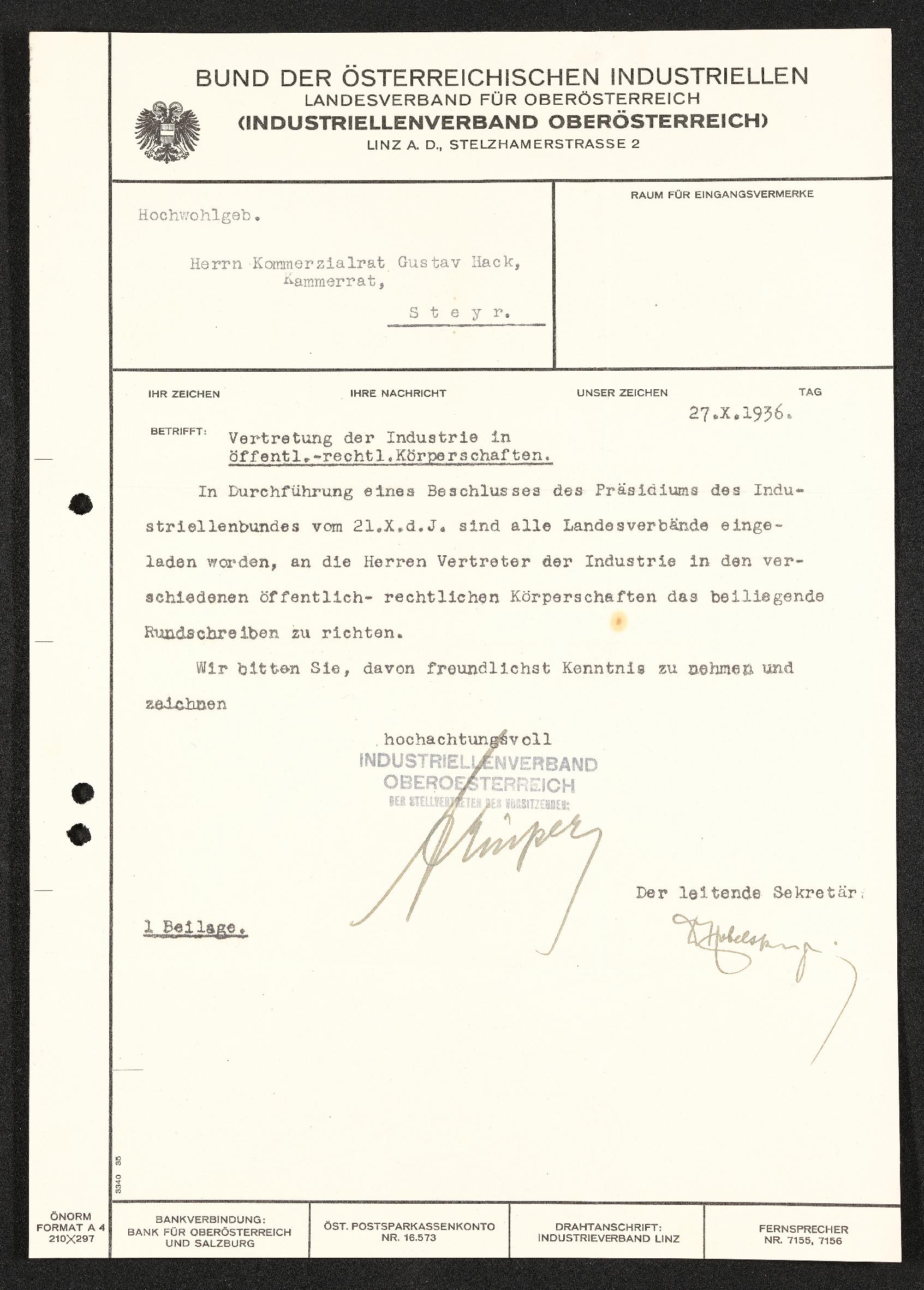 | Beschreibung | Schreiben vom Bund der österreichischen Industriellen, Landesverband für Oberösterriech an Gustav Hack, 27. Oktober 1936 |