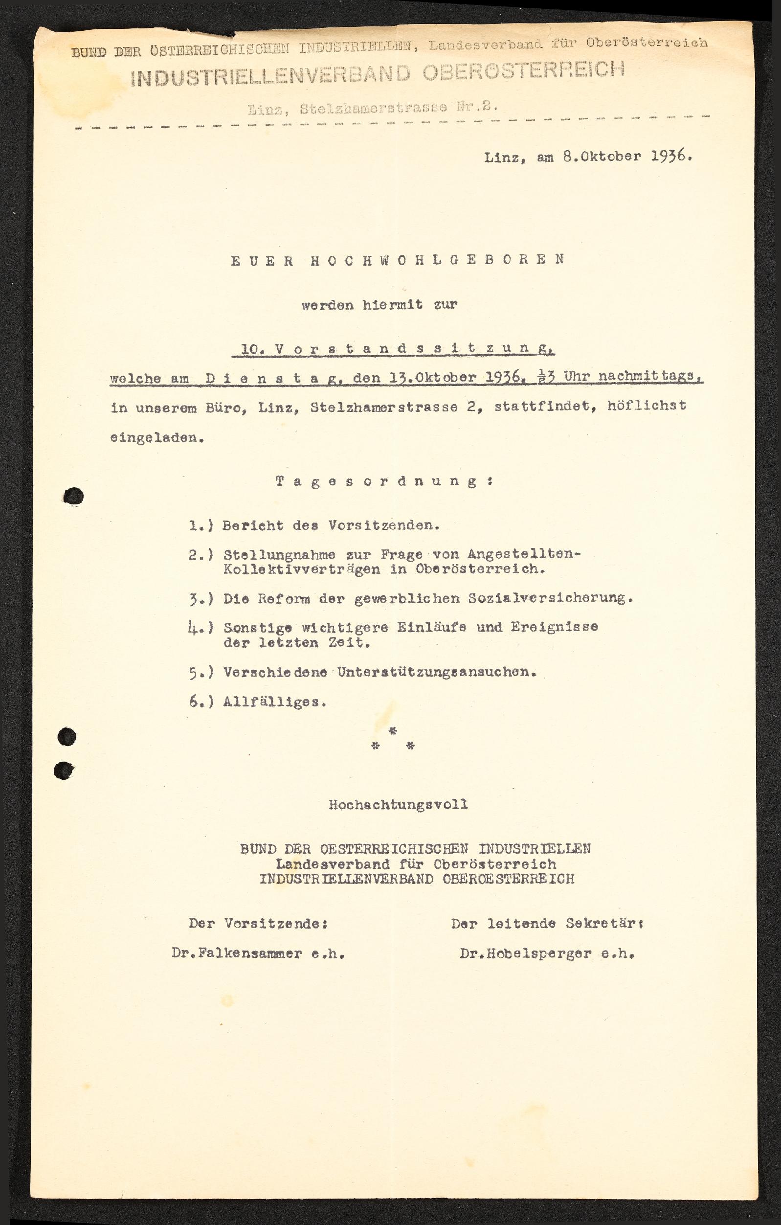 | Beschreibung | Einladung zur 10. Vorstandssitzung, Linz, 8. Oktober 1936, Bund der österreichischen Industriellen, Landesverband für Oberösterriech, Industriellenverband Oberösterreich, Rückseite mit handschriftlichen Vermerken |
