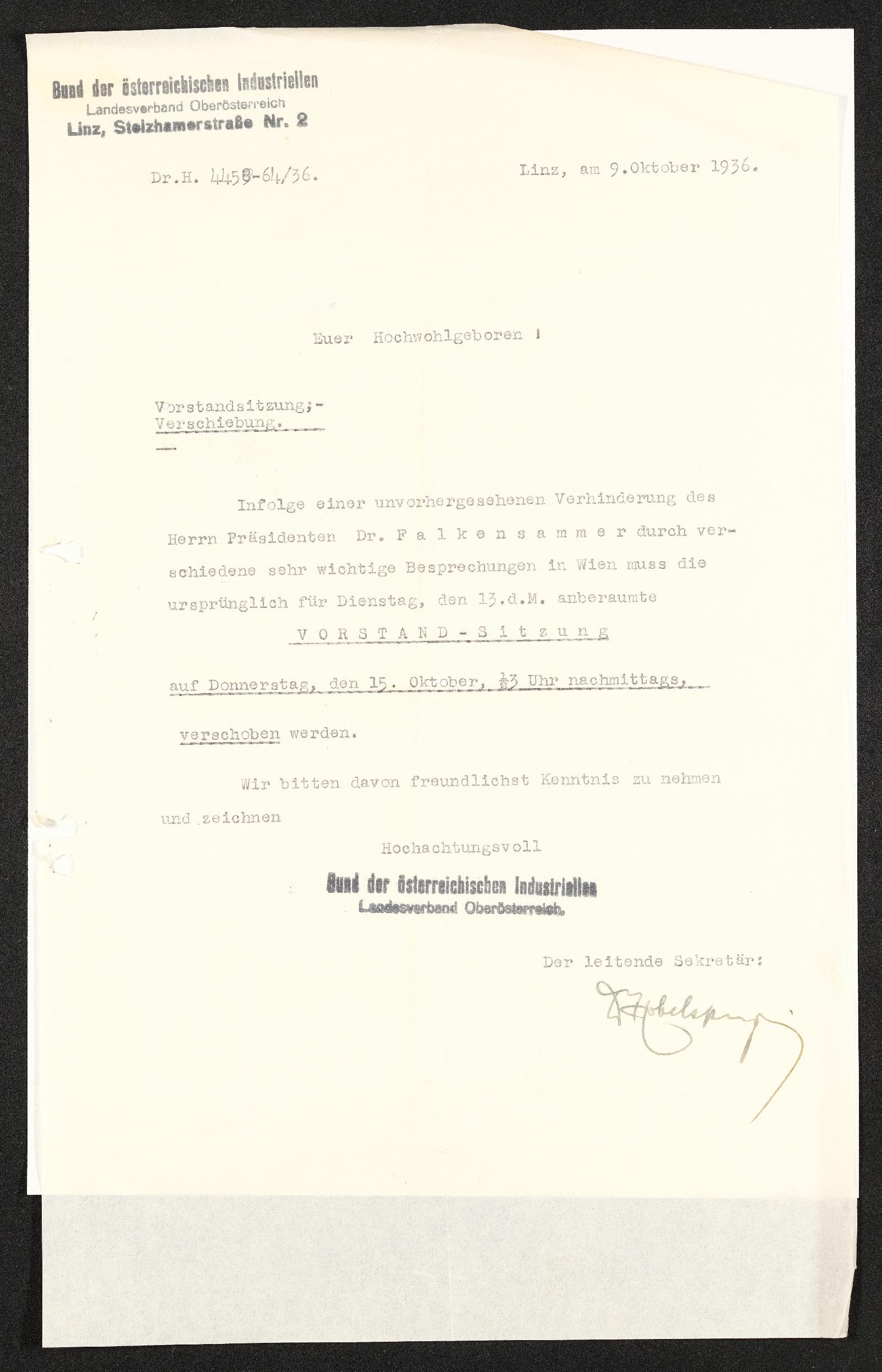 | Beschreibung | Schreiben vom Bund der österreichischen Industriellen, Landesverband für Oberösterriech an Gustav Hack betreffend Verschiebung der Vorstandssitzung, Linz, 9. Oktober 1936 |