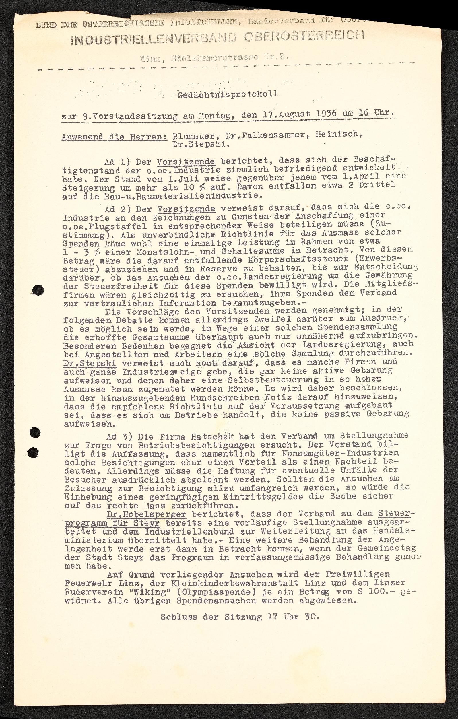 | Beschreibung | Gedächntnisprotokoll zur 9. Vorstandssitzung am 17. August 1936, Bund der österreichischen Industriellen Landesverband für Oberösterriech, Industriellenverband Oberösterreich |