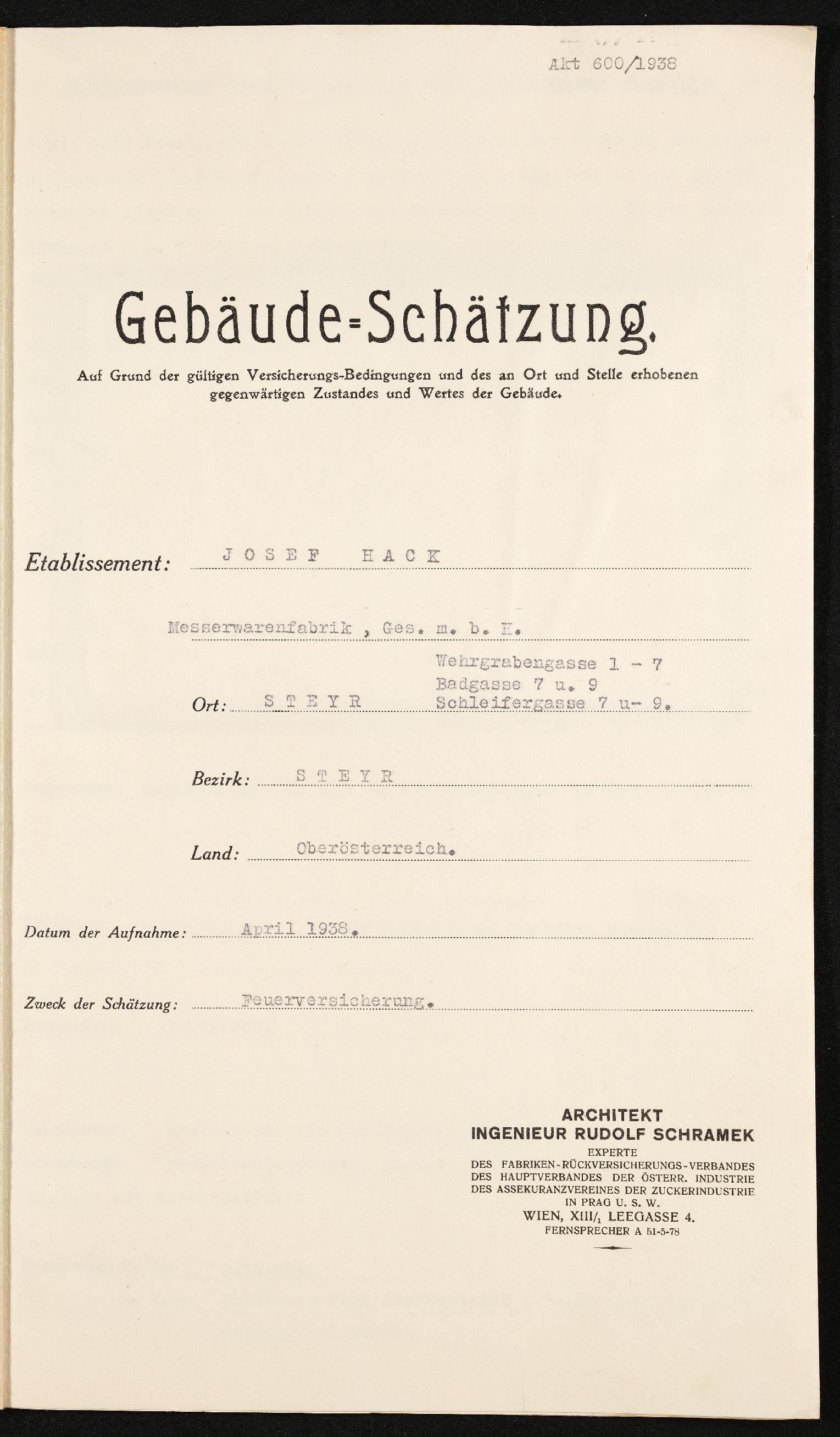 | Beschreibung | Gebäudeschätzung, Josef Hack, Messerwarenfabrik Ges.m.b.H, Steyr, 1938 |