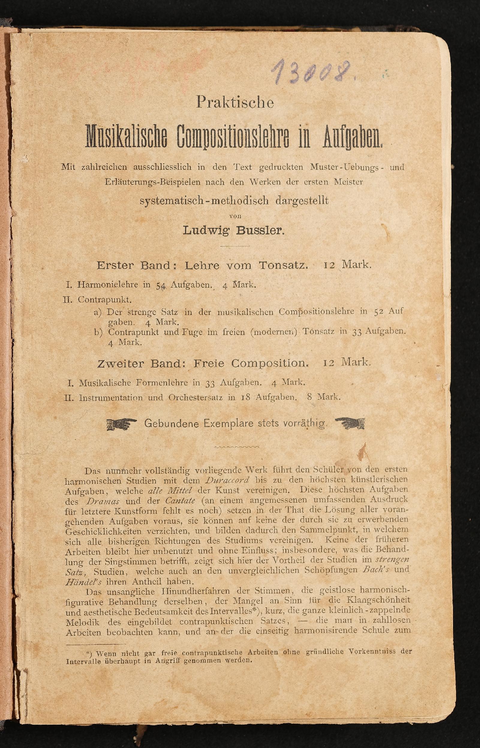 | Beschreibung | Musikbuch Praktische Musikalische Compositionslehre in Aufgaben, systematisch-methodisch dargestellt von Ludwig Bussler, Berlin, 1878 |