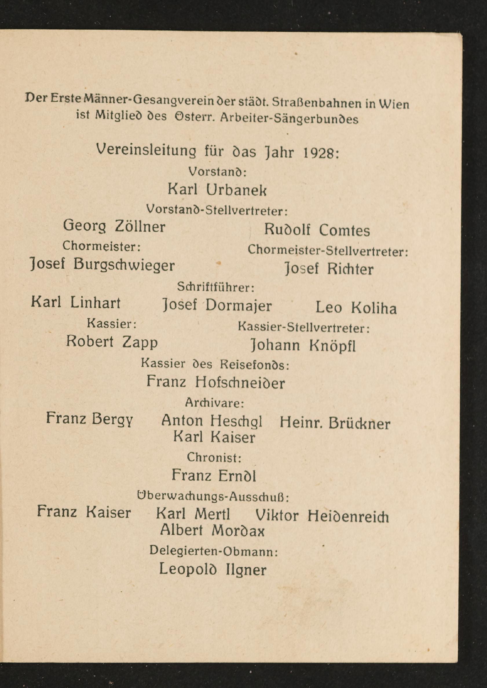 | Beschreibung | Jahresbericht des ersten Männer-Gesangsvereines der städtischen Straßenbahnen in Wien über das 26. Vereinsjahr 1928 |