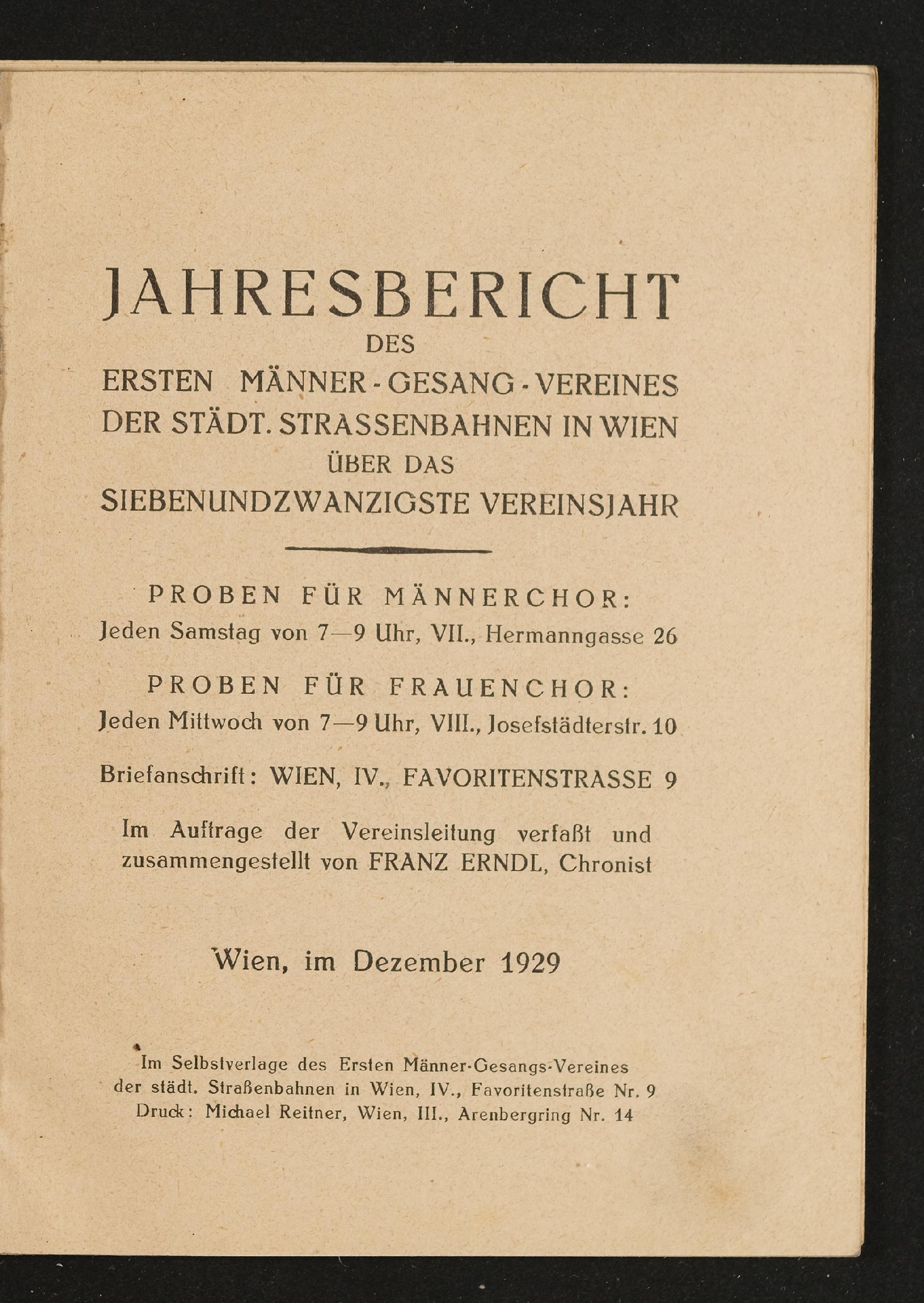 | Beschreibung | Jahresbericht des ersten Männer-Gesangsvereines der städtischen Straßenbahnen in Wien über das 27. Vereinsjahr 1929 |