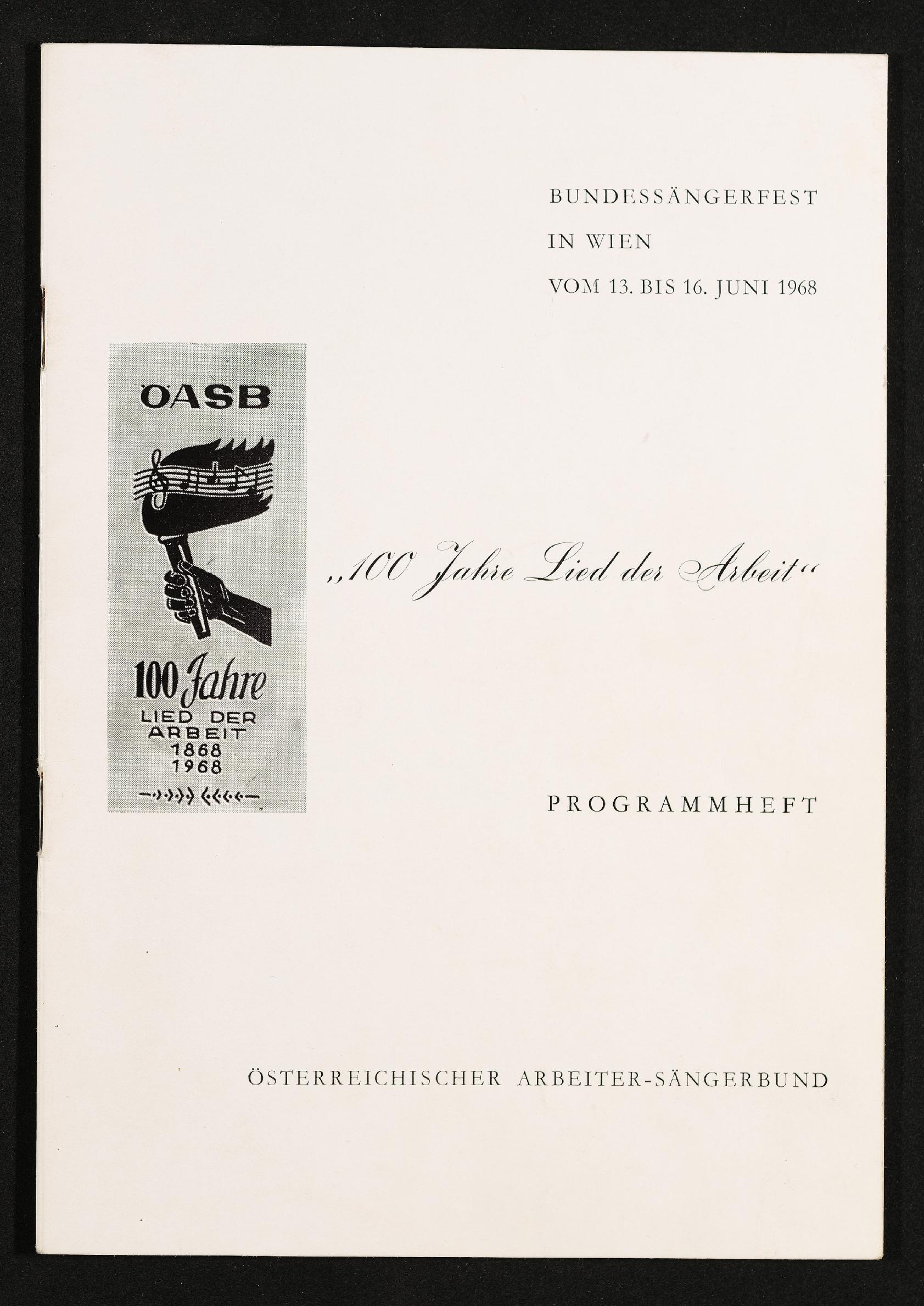 | Beschreibung | Programmheft des Österreichischen Arbeitersängerbundes anläßlich des Bundessängerfestes in Wien vom 13. bis 16. Juni 1968, "100 Jahre Lied der Areit" 1868-1968 |