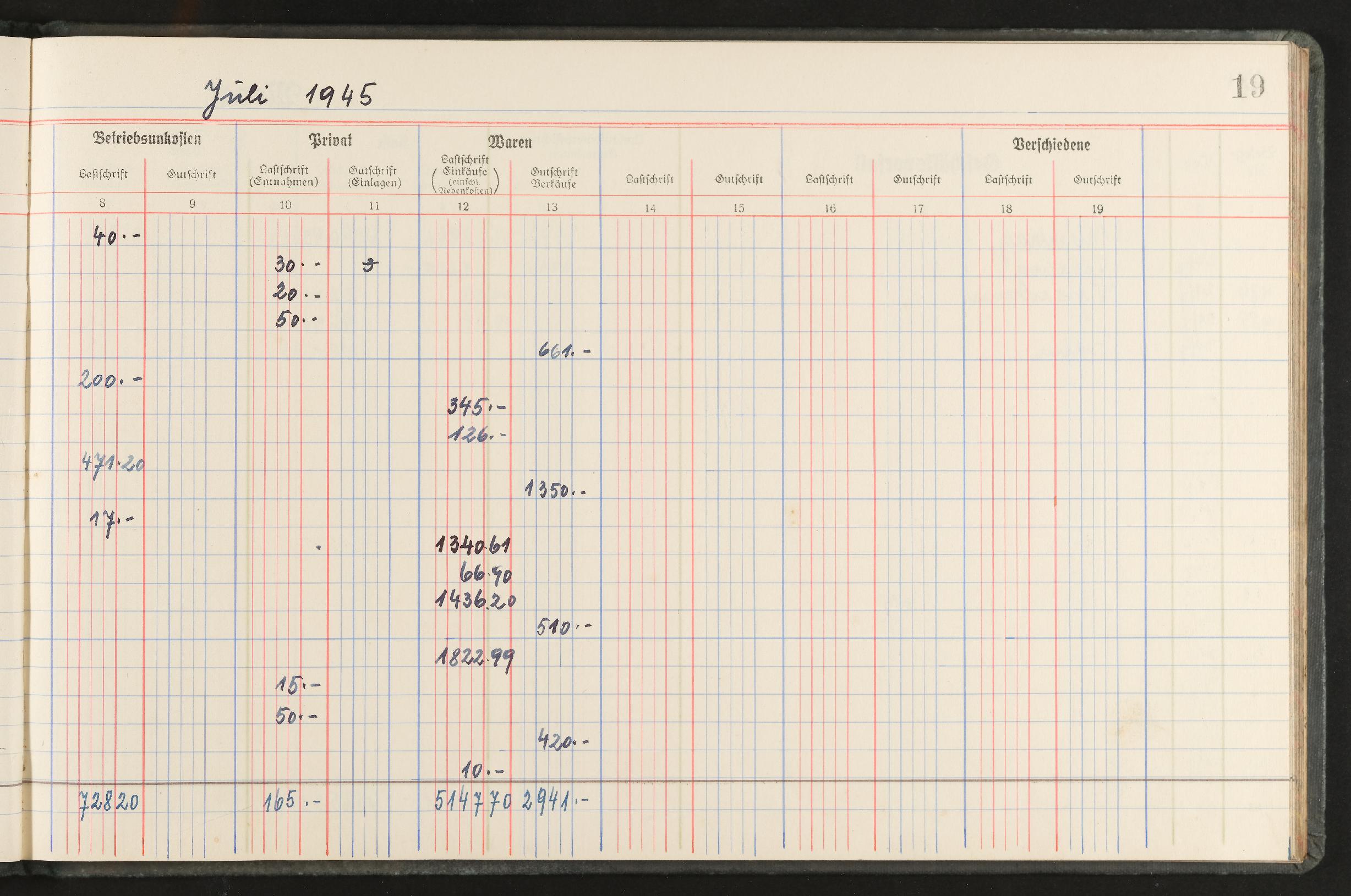 | Beschreibung | Geschäftstagebuch für den Einzelhandel nach den Mindestanforderungen für die Buchführungspflicht, Marke Alma, für den Zeitraum November 1944 bis April 1946 |