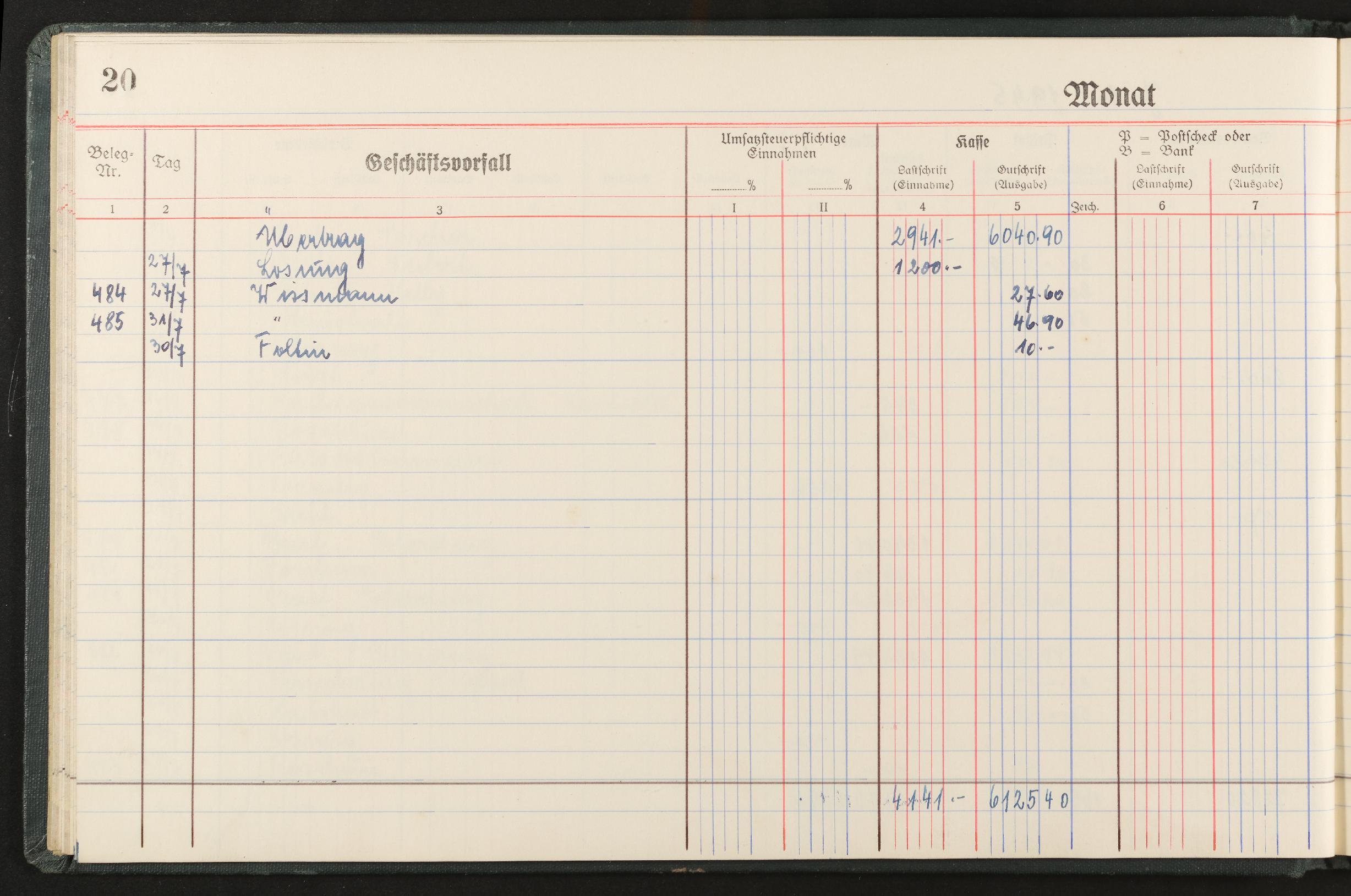 | Beschreibung | Geschäftstagebuch für den Einzelhandel nach den Mindestanforderungen für die Buchführungspflicht, Marke Alma, für den Zeitraum November 1944 bis April 1946 |