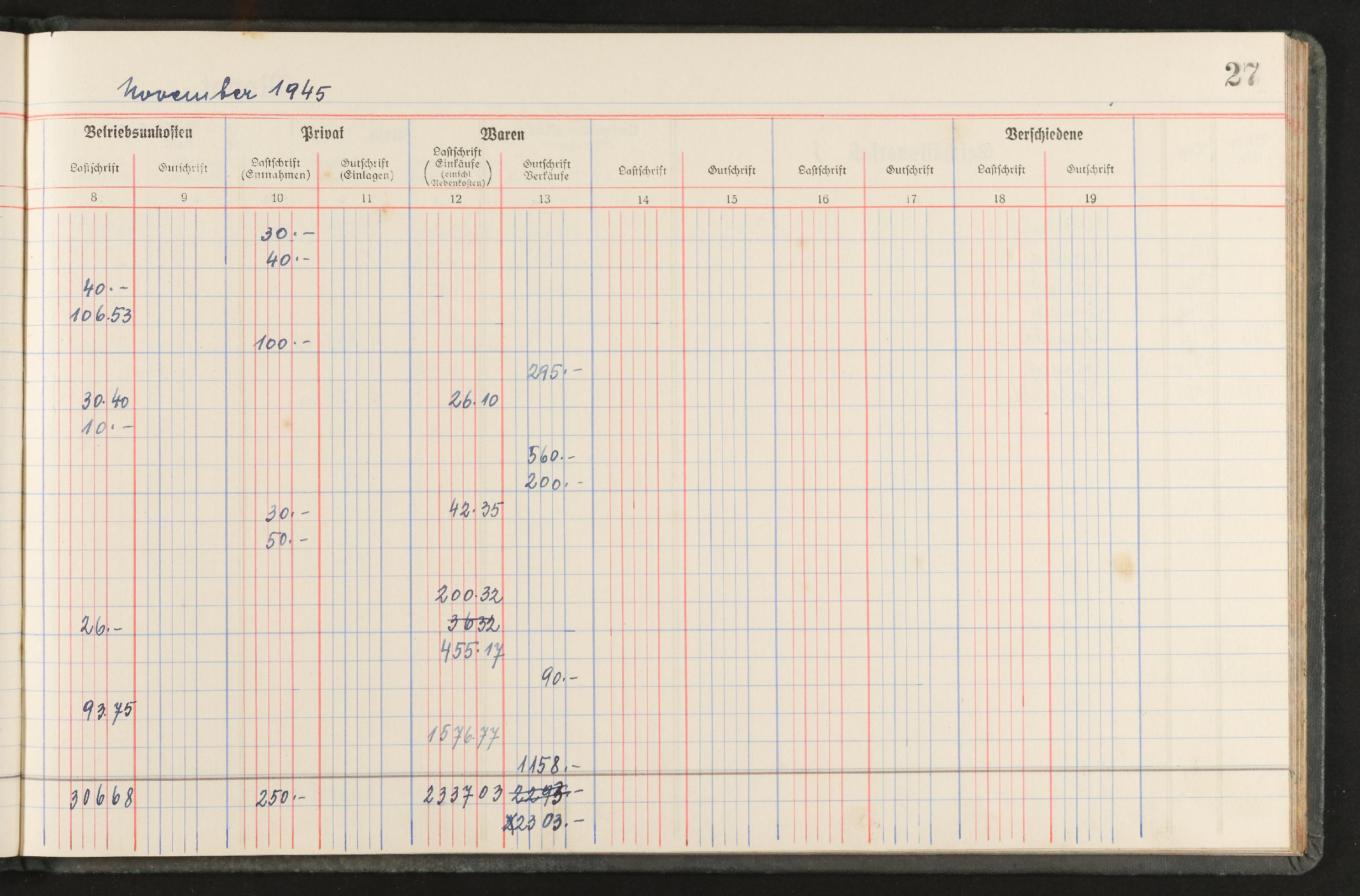 | Beschreibung | Geschäftstagebuch für den Einzelhandel nach den Mindestanforderungen für die Buchführungspflicht, Marke Alma, für den Zeitraum November 1944 bis April 1946 |