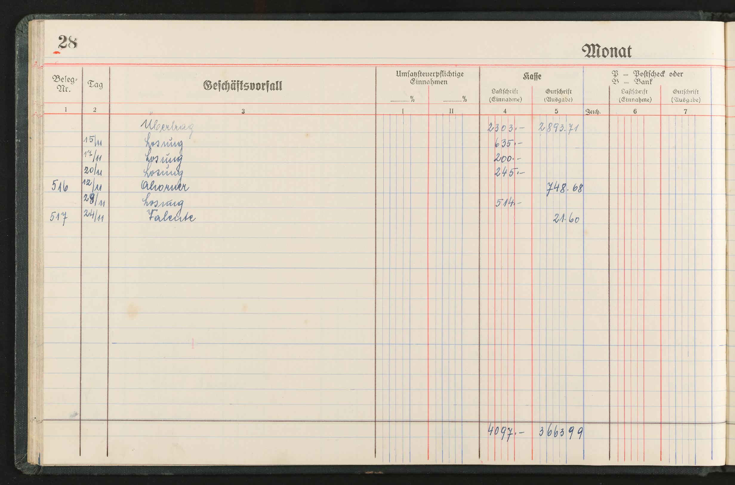 | Beschreibung | Geschäftstagebuch für den Einzelhandel nach den Mindestanforderungen für die Buchführungspflicht, Marke Alma, für den Zeitraum November 1944 bis April 1946 |