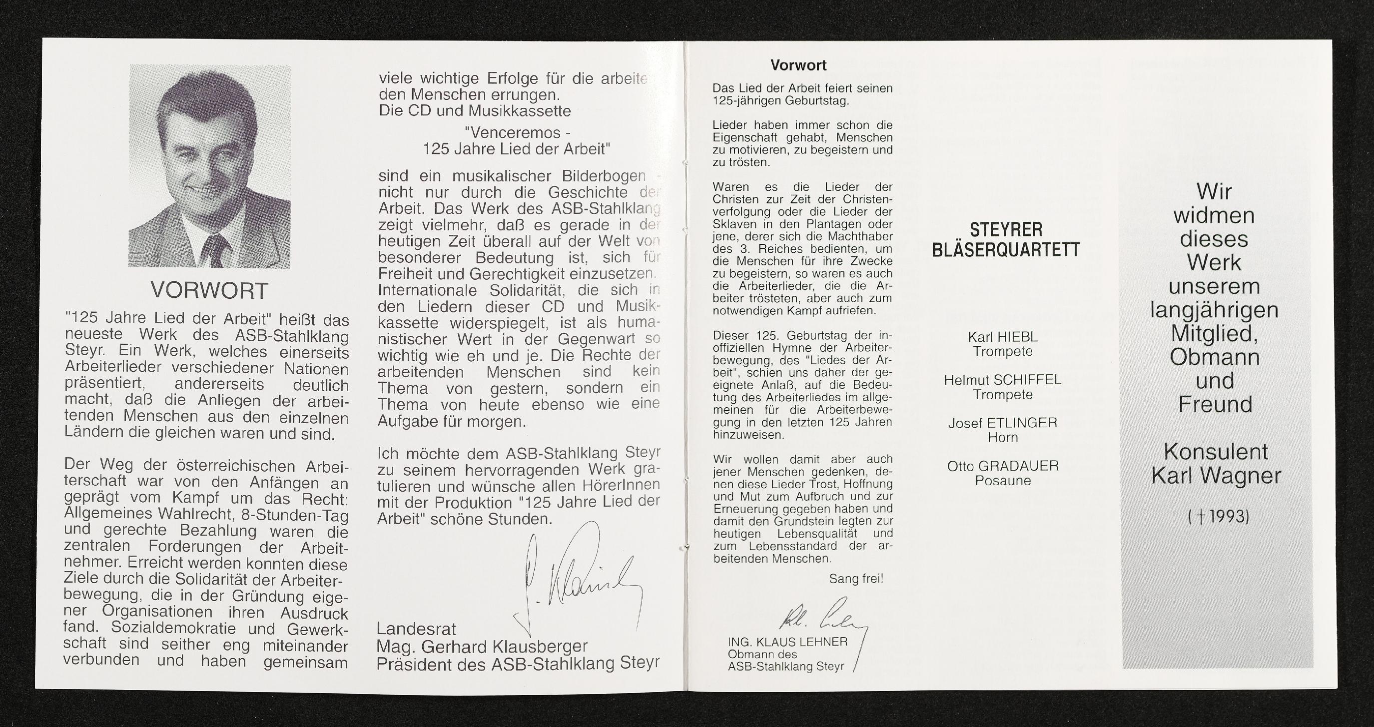 | Beschreibung | CD 125 Jahre Lied der Arbeit, Arbeitersängerbund Stahlklang Steyr, Steyrer Bläserquartett, Dirigent - Martin L. Fiala, Vorwort |