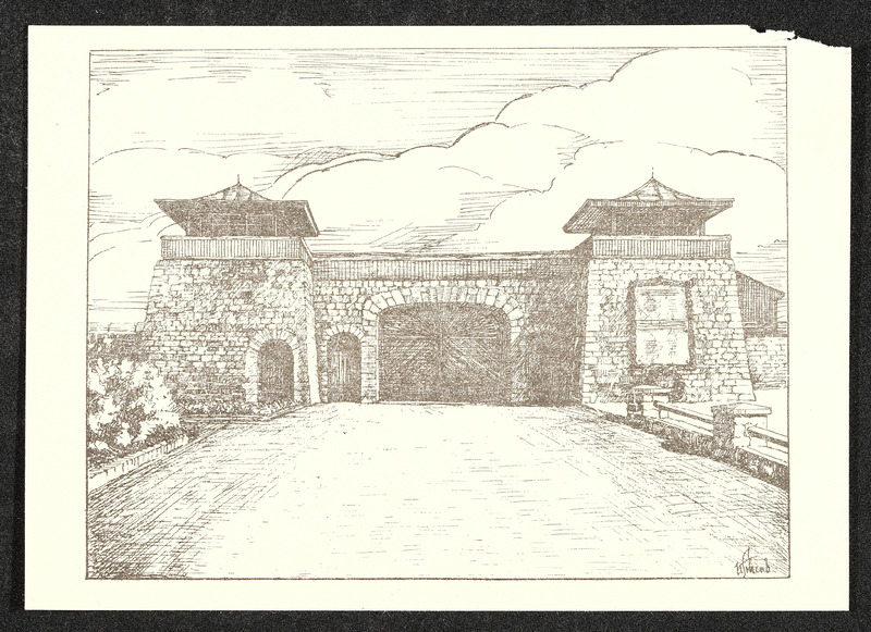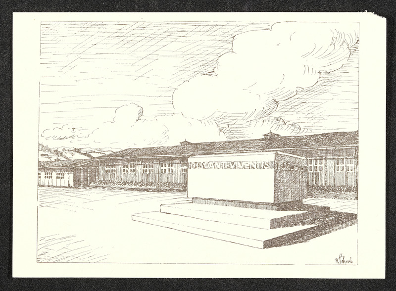 Ansichtskarte mit gezeichneter Darstellung ehemaligen Konzentrationslager Mauthausen