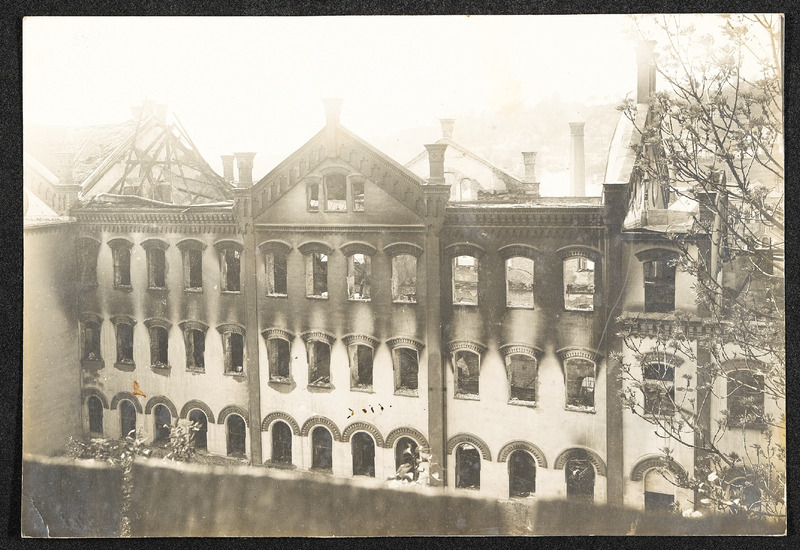 Abgebranntes Fabriksgebäude der Waffenfabrik im Wehrgraben in Steyr, Objekt IX, 1. Mai 1913, Detailansicht