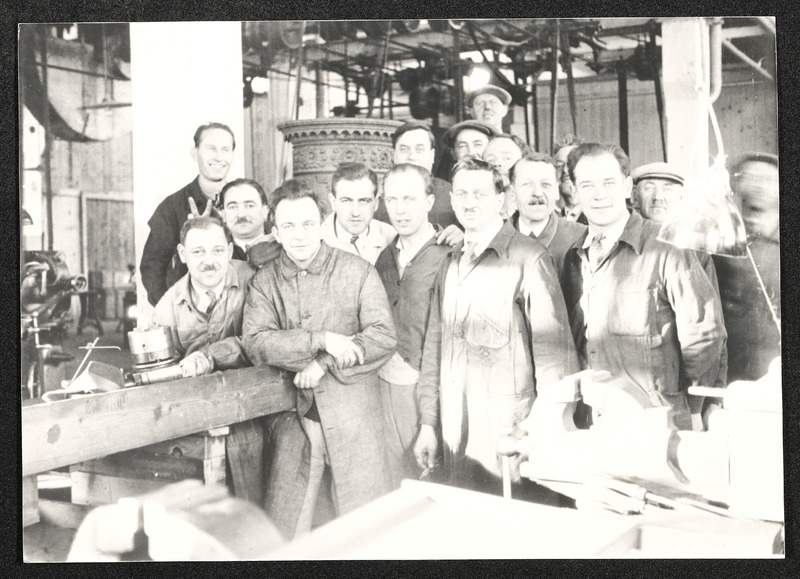 Gruppenfoto von Arbeitern Lehrenbau, Steyr-Werke, 1930, Arbeitskollegen von Alois Zehetner (geb. 1906)