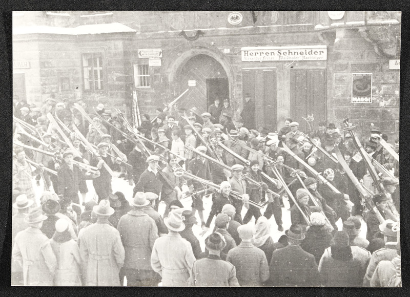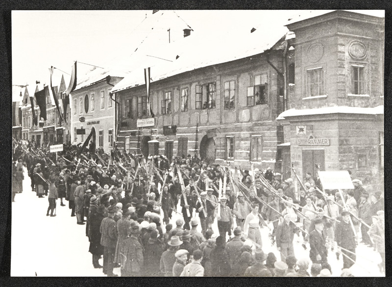 Einzug der Arbeitersportlerinnen und Arbeitersportler aus Oberösterreich bei der 2. Internationalen Arbeiter-Winterolympiade in Mürzzuschlag, 5. Februar bis 8. Februar 1931