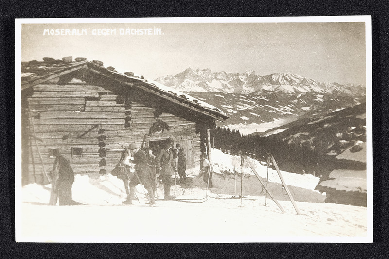 Moseralm mit Hütte und Skifahrern
