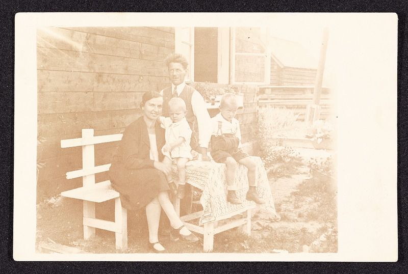 Eltern mit zwei Kindern auf einer Bank vor einem Haus