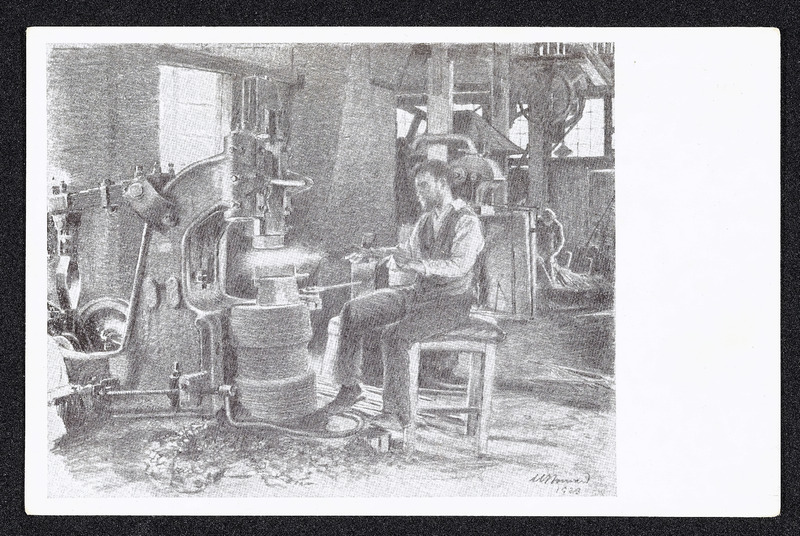 Stilisierte Druckgrafik eines Sensenarbeiters der Sensen- und Stahlwerke Franz De Paul Schröckenfux