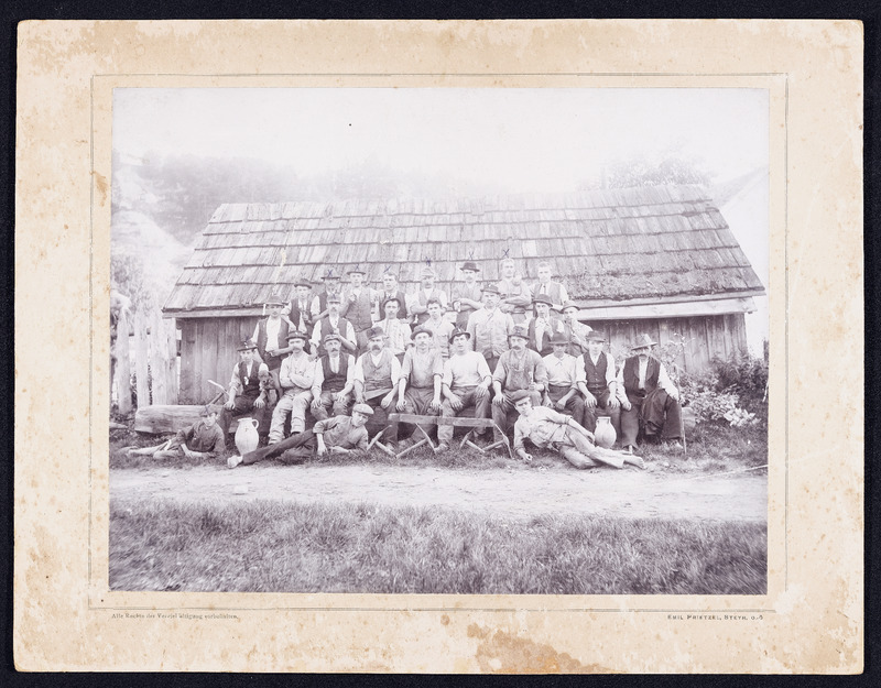 https://www.wikidata.org/wiki/Q192425 https://www.wikidata.org/wiki/Q192425 POSTKARTE mit Motiv einer stilisierten Szene, drei Eisenbahner mit Krügen und einem Hund auf dem Schoß. Grußschreiben an Herrn Kopf, Rosenau in Niederösterreich, in Kurrentschrift auf der Rückseite