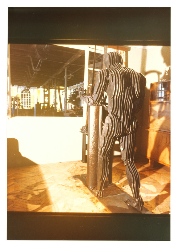 Museum Arbeitswelt, Stahlmensch, Ausstellungsobjekt: "Mensch an der Transmission" schaut in Fabrikshalle mit Webstühlen
