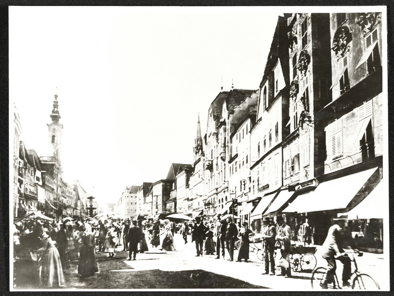 Stadtplatz in Steyr mit Markt (zwischen 1918 und 1938)