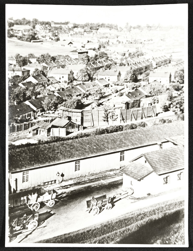 Steyrtalbahnhof in der Redtenbachergasse 14 in Steyr, im Hintergrund Arbeiterhäuser Eysnfeld (heute Wehrgraben) (zwischen 1918 und 1938)