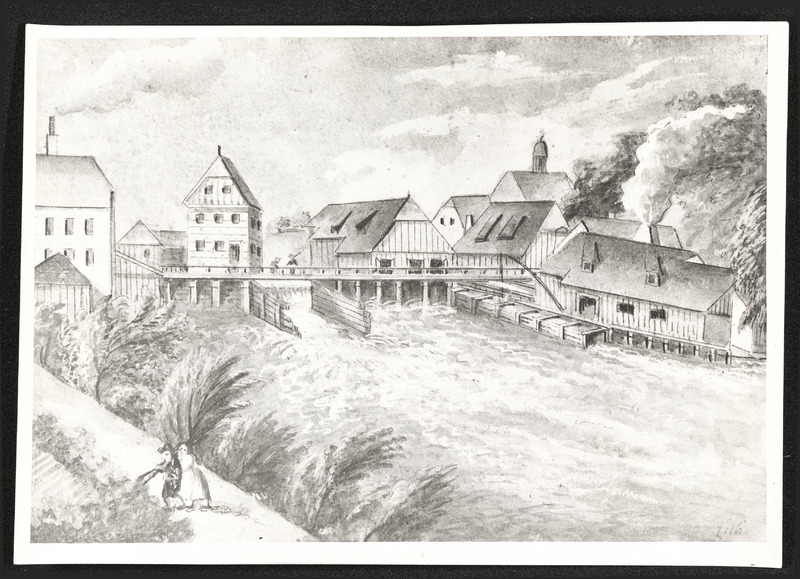 Zeichnung, Ansicht (vor 1914) der ersten Zeugstätte am Fluss Steyr im Wehrgraben in Steyr mit Schleifen, Drahtzug, Mühle, Papiermühle,Hammerwerk