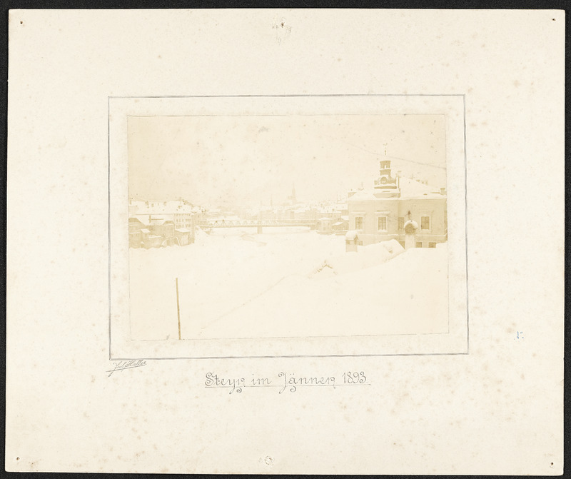 Steyr im Jänner 1893. Blick von der Schlüsselhofgasse vorbei beim Haus Michaelerplatz 10 (mit Türmchen) Richtung Ennsbrücke und Stadtpfarrkirche.