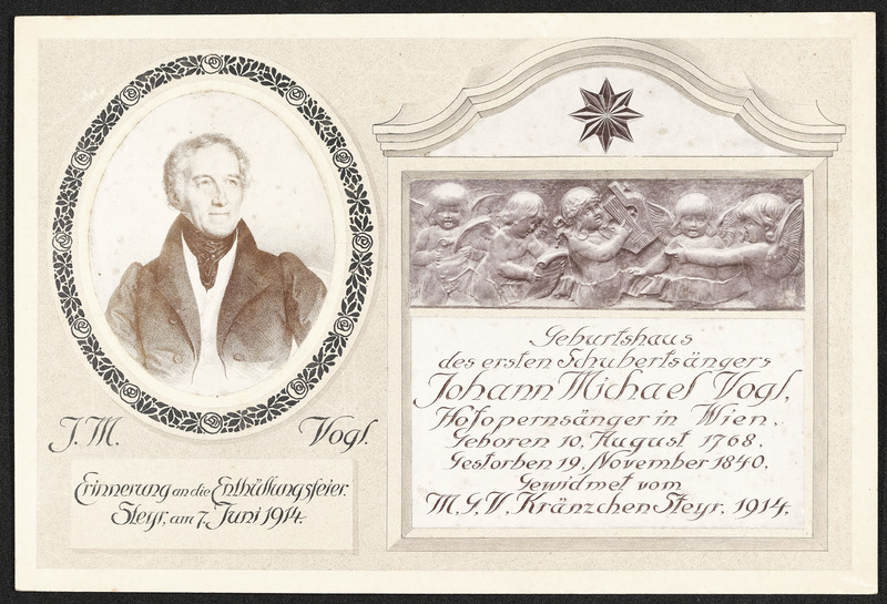 7. Juni 1914 Enthüllung eines Denkmals für Johann Michael Vogl (*10. August 1768, +19. November 1840) an seinem Geburtshaus in der Haratzmüllerstraße 32 in Steyr
