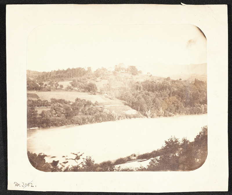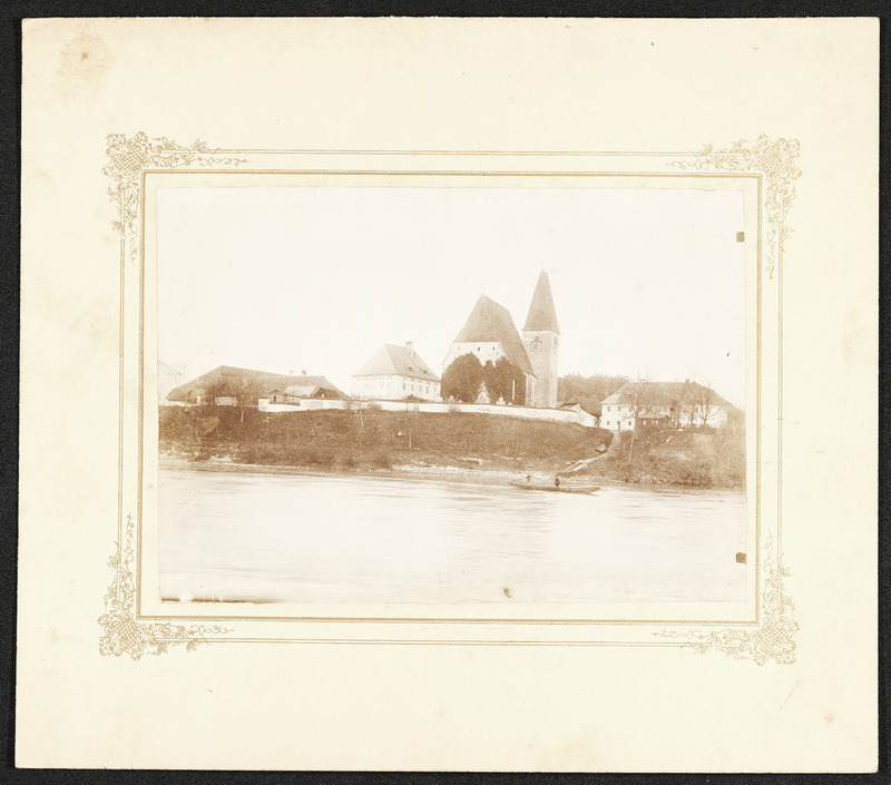 Blick über den Fluss Enns nach St. Ulrich bei Steyr vor 1868 mit dem alten Turm der Pfarrkirche St. Ulrich