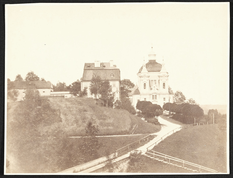 Ansicht der Wallfahrtskirche Christkindl mit Pfarrhaus und Nebentrakt mit Krippenausstellungen
