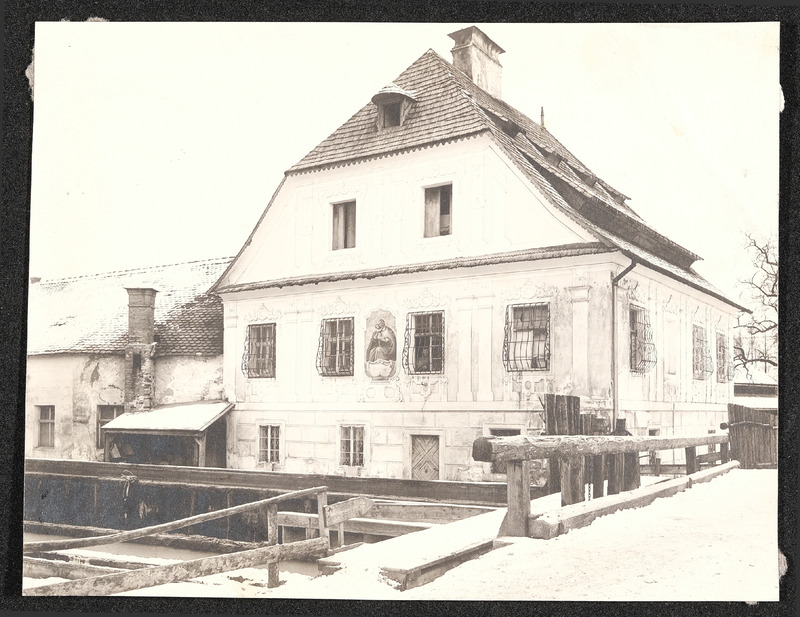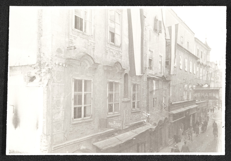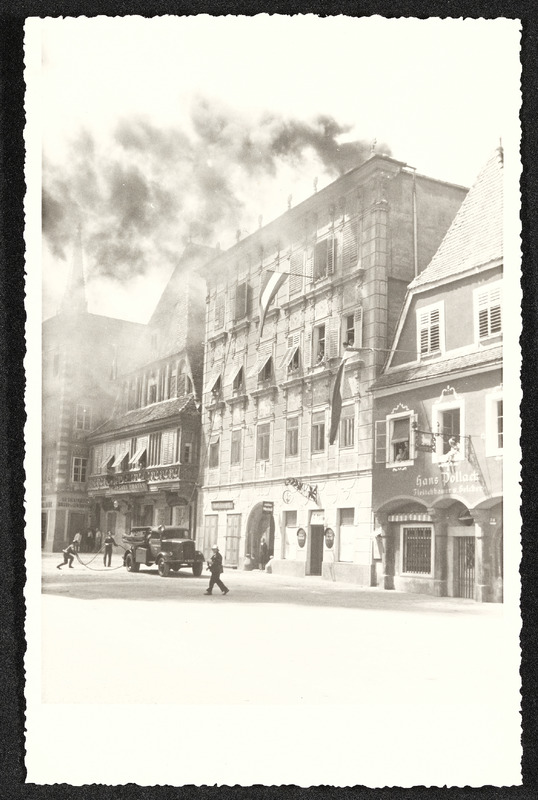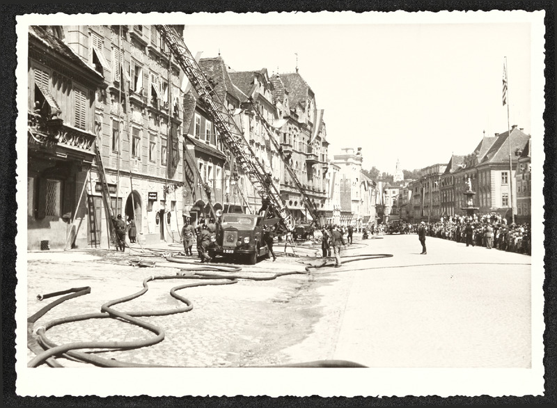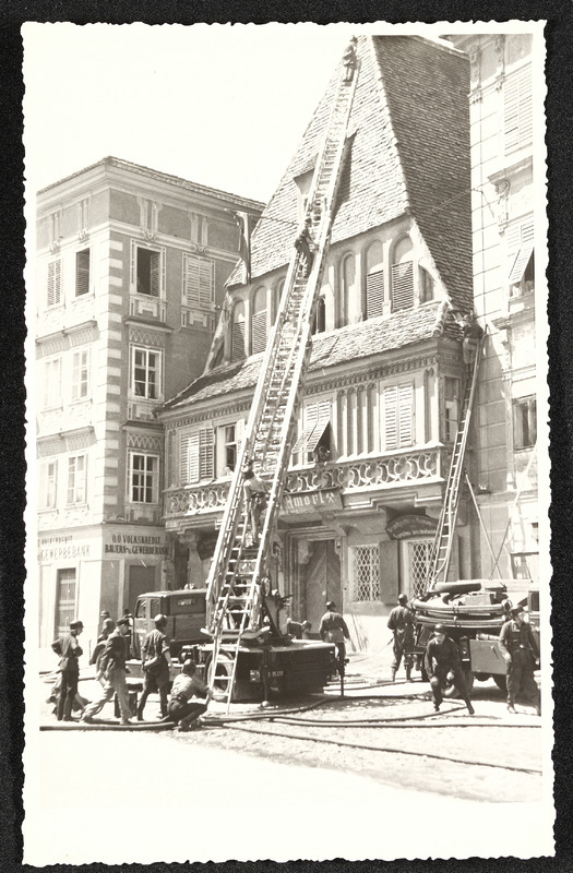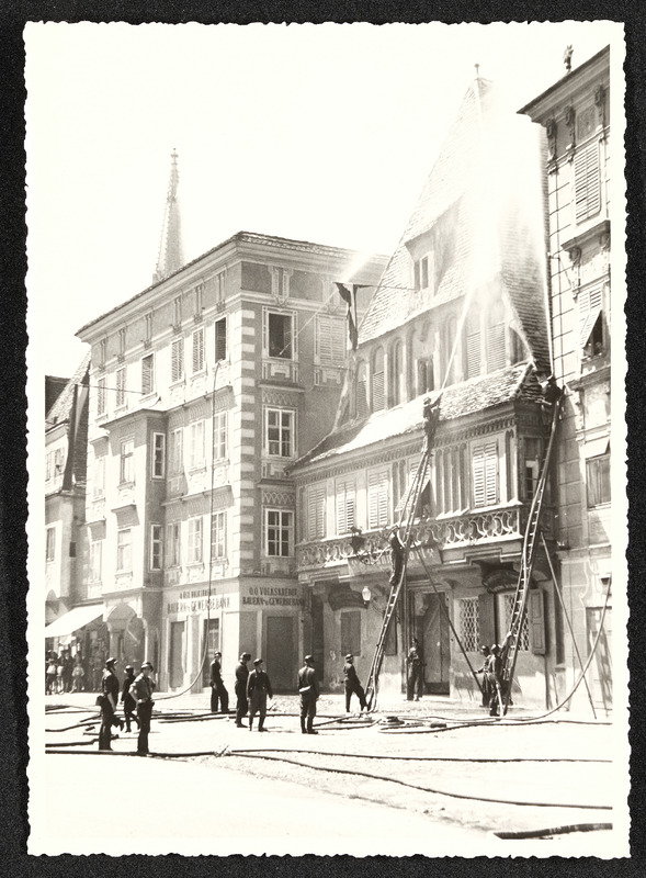 Feuerwehrübung am 7. August 1949, Brandannahme Gebäude am Stadtplatz 30 in Steyr brennt. Das angrenzende Gebäude, das Bummerlhaus, wird vor dem Übergreifen der Flammen geschützt.