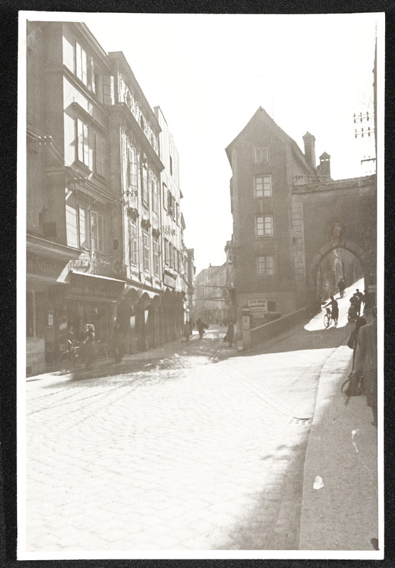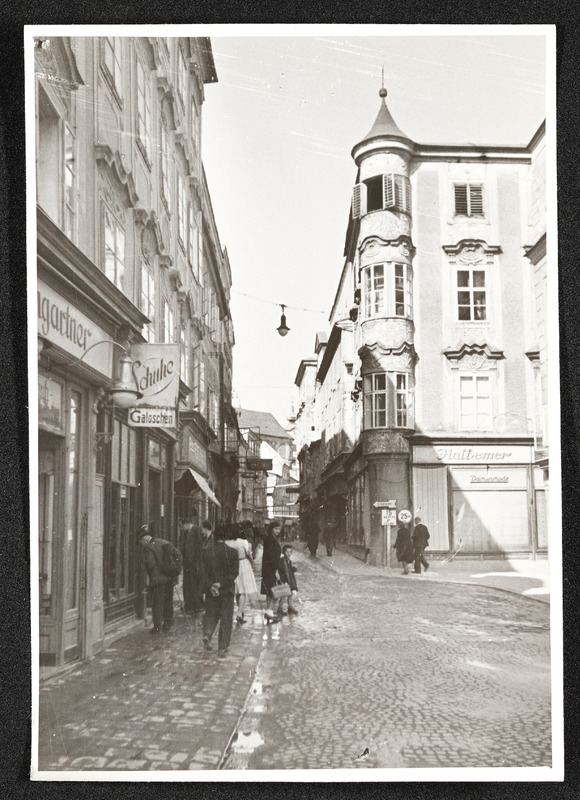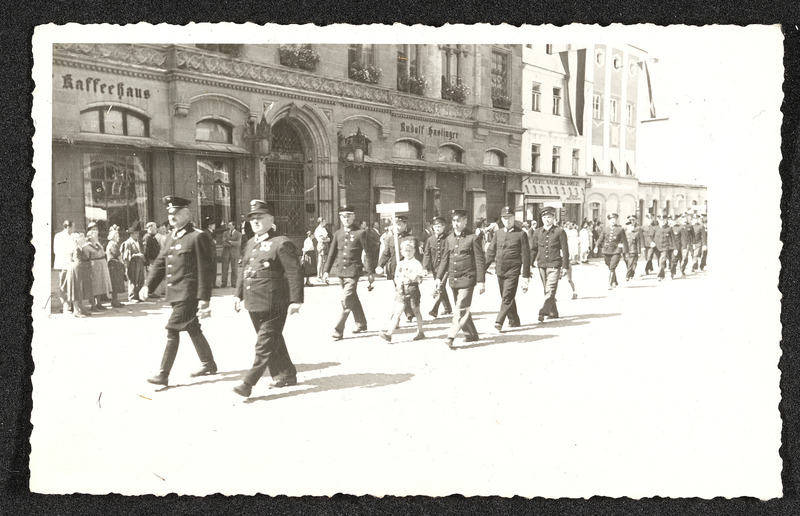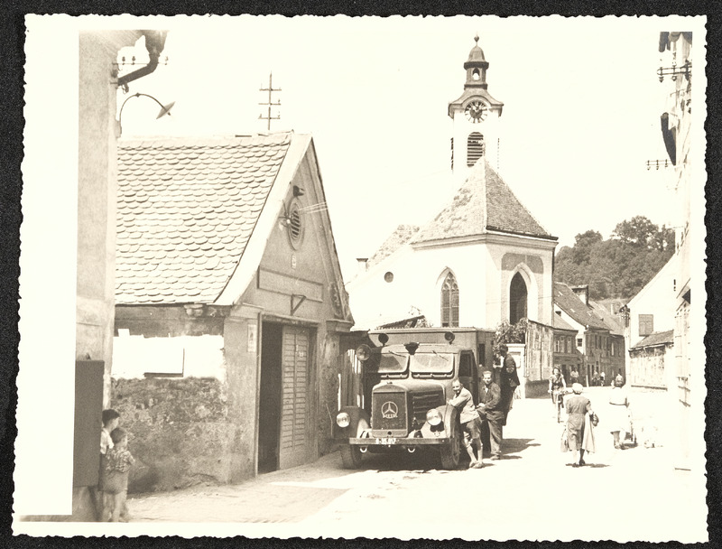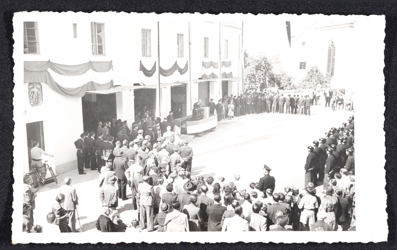 Mannschaft der Feuerwehrübung am 7. August 1949, Brandannahme Gebäude am Stadtplatz 30 in Steyr brennt. Eine Feuerwehrleiter steht hier beim Haus Stadtplatz 24 in Steyr.