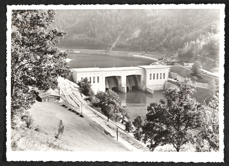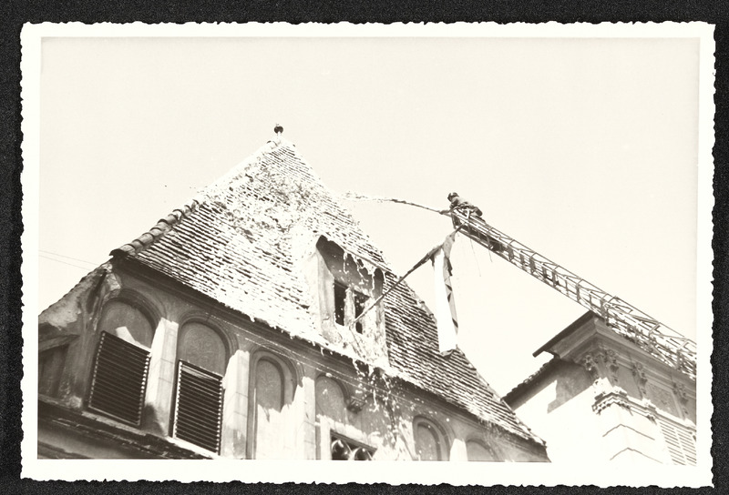 Feuerwehrübung am 7. August 1949, Brandannahme Gebäude am Stadtplatz 30 in Steyr brennt. Das Dach des angrenzenden Gebäudes, Bummerlhaus genannt, wird vor dem Übergreifen der Flammen geschützt.