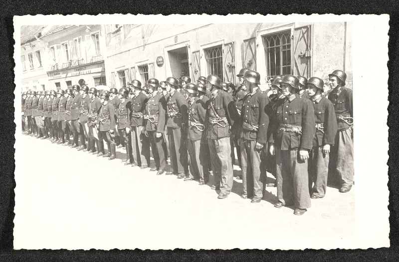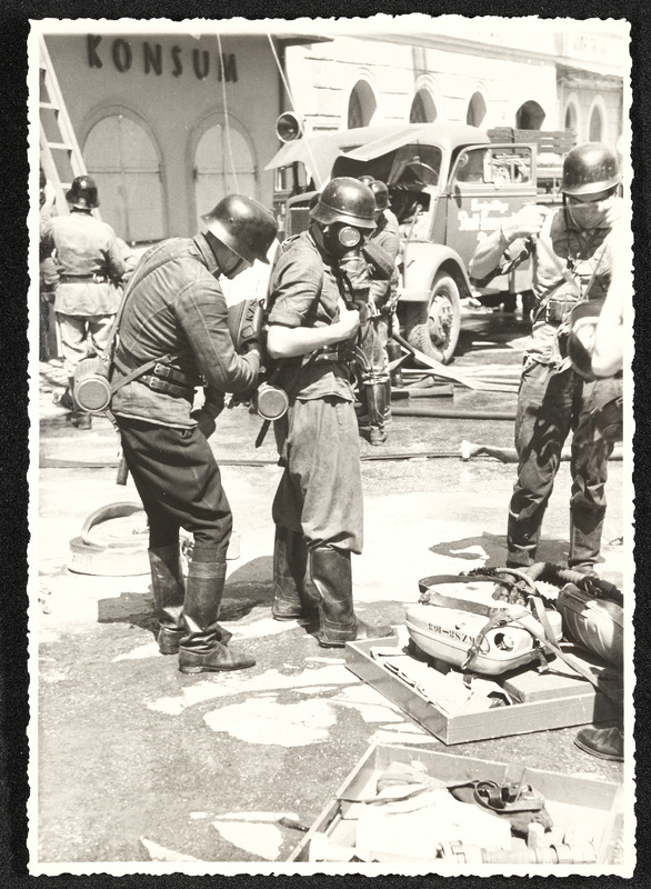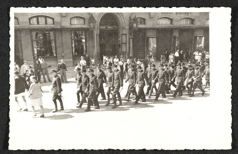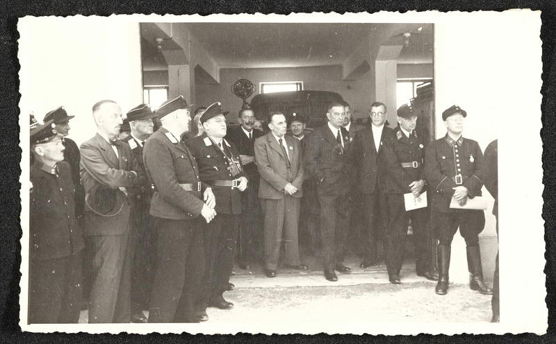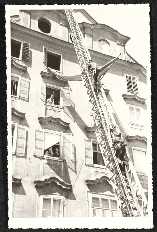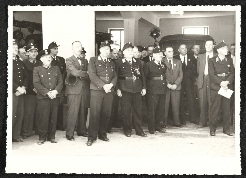 Mannschaft der Feuerwehrübung am 7. August 1949, Brandannahme Gebäude am Stadtplatz 30 in Steyr brennt. Eine Feuerwehrleiter steht hier beim angrenzenden Bummerlhaus, Stadtplatz 32 in Steyr.