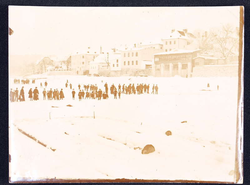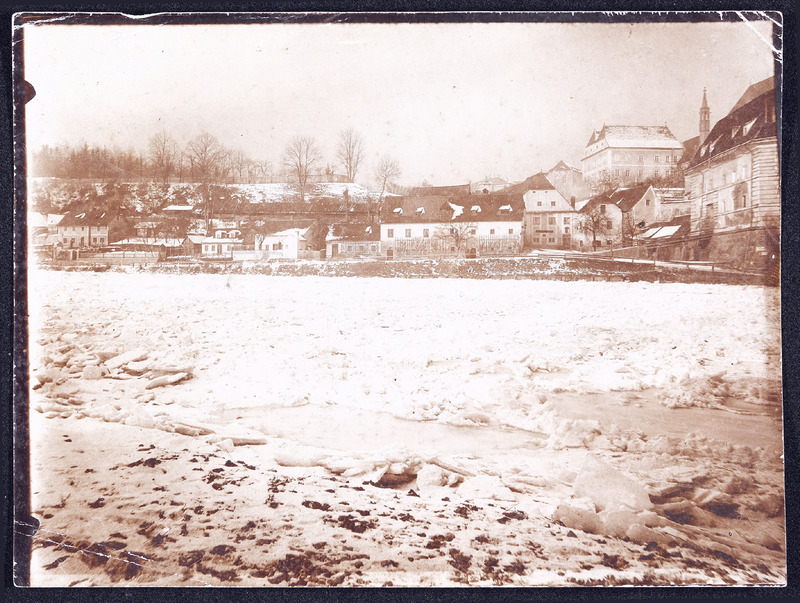 Zugefrorene Enns im Winter 1908 oder 1929. Blick vom rechten Ennsufer zum gegenüberliegenden Neutor in Steyr. Oberhalb ist der Turm der Stadtpfarrkirche zu sehen.