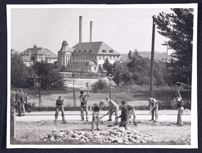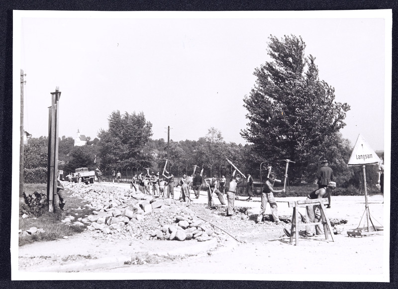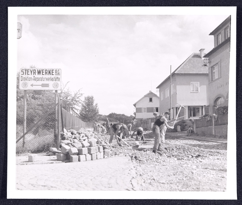 Straßenbau bei den Steyr-Werken nach 1945. Blick von Schönauersstraße Richtung Taborturm in Steyr.
