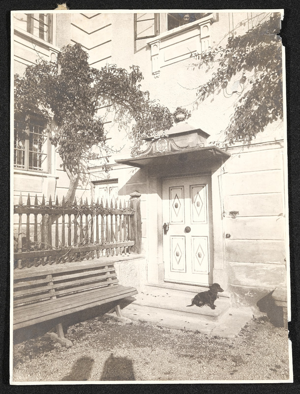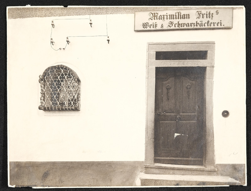 Fenstergitter und Eingangstüre der Weiß & Schwarzbäckerei Maximilian Fritz in Sierninghofen bei Steyr. Das Datum der Aufnahme ist nicht bekannt.