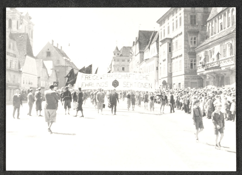 Steyr, Stadtplatz, Maiaufmarsch an einem 1. Mai, Transparent "Freigewerkschaftliche Lehrlingssektionen"