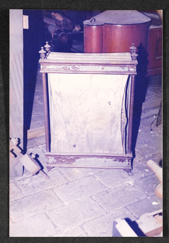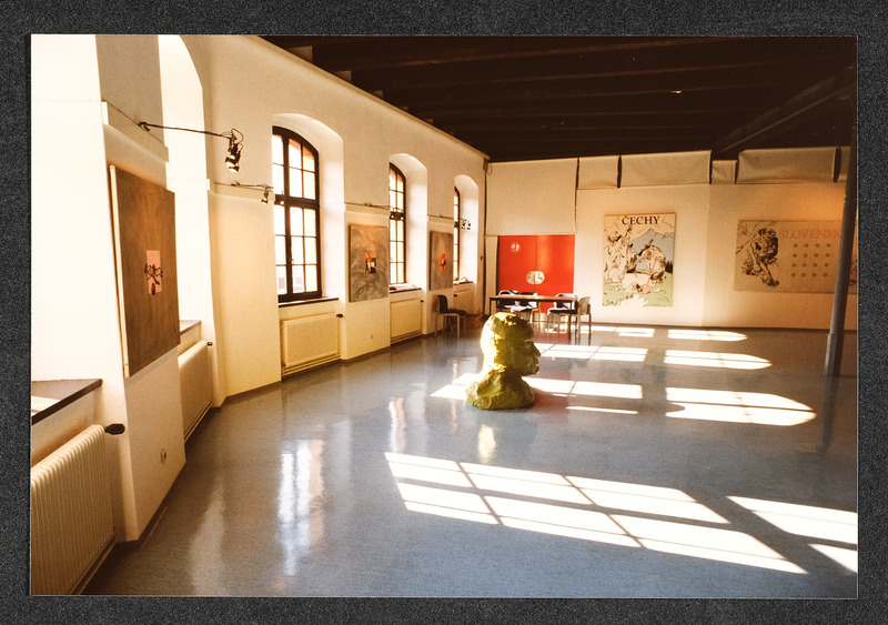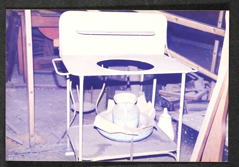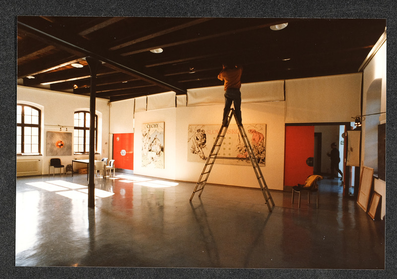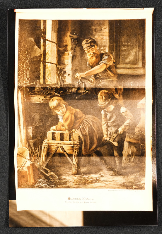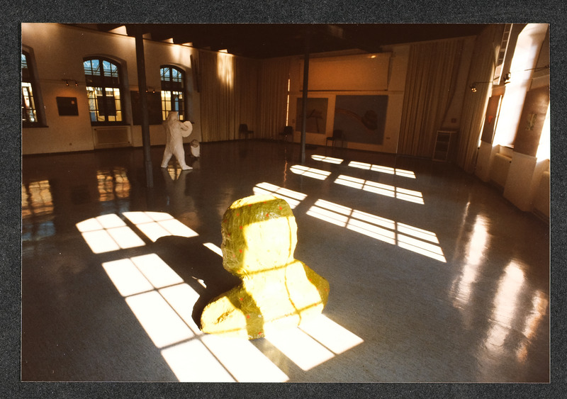 Das Foto vom Juni 1986 aus einem Buch oder Katalog zeigt eine Werkstatt nach dem Gemälde von Georg Schöbel, Titel "Ungefährliche Konkurrenz"